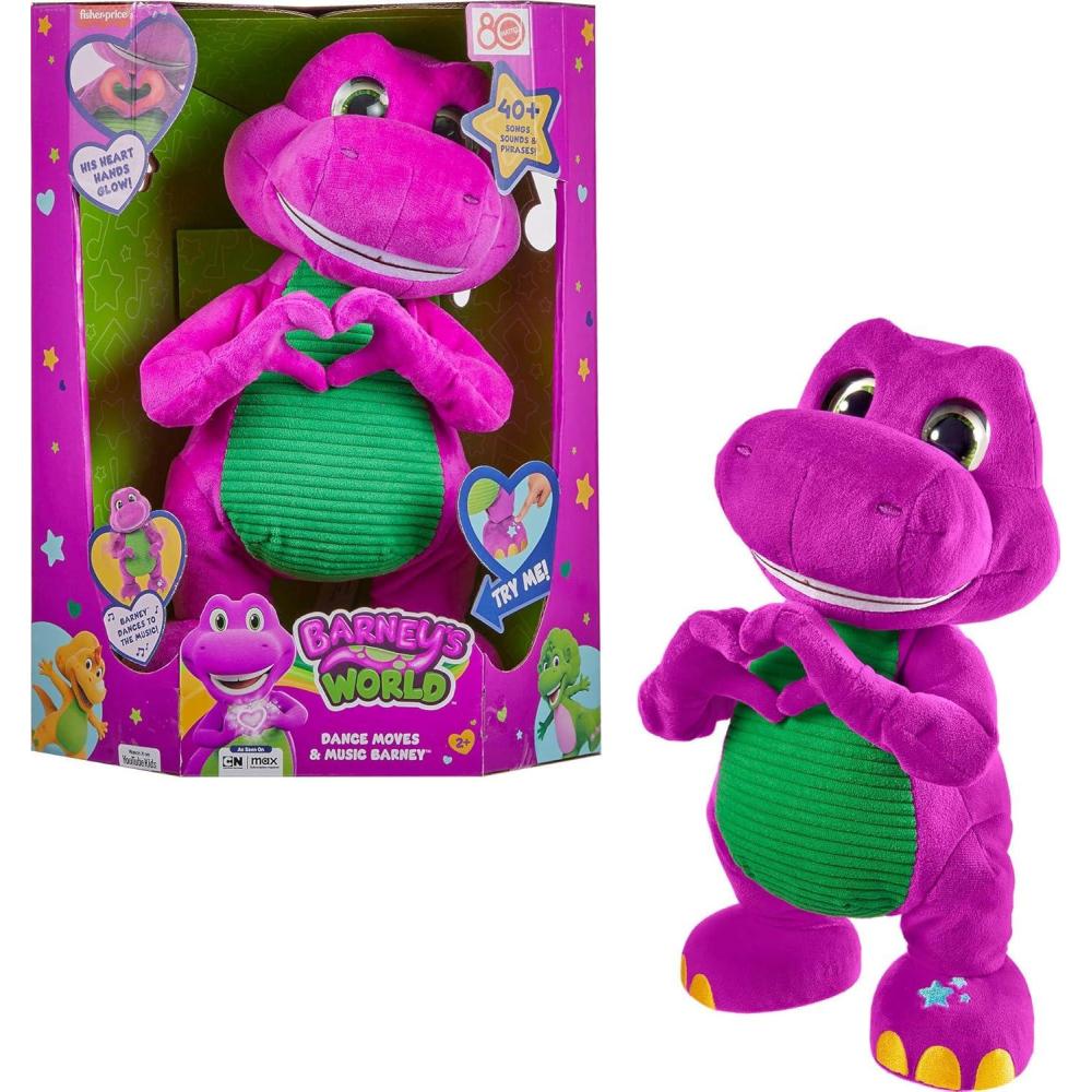 It's a Barney dance-a-thon! With a press of his foot, Barney starts performing his famous dance moves and making music. He sings songs from Barney's World like “I Love You! (I Love Me Too!). Kids are invited to join the party by dancing and singing along! Barney's hands also move and make a glowing LED heart hands gesture. Makes 30+ phrases, sounds, and 3 sing-along songs! Colors and decorations may vary.