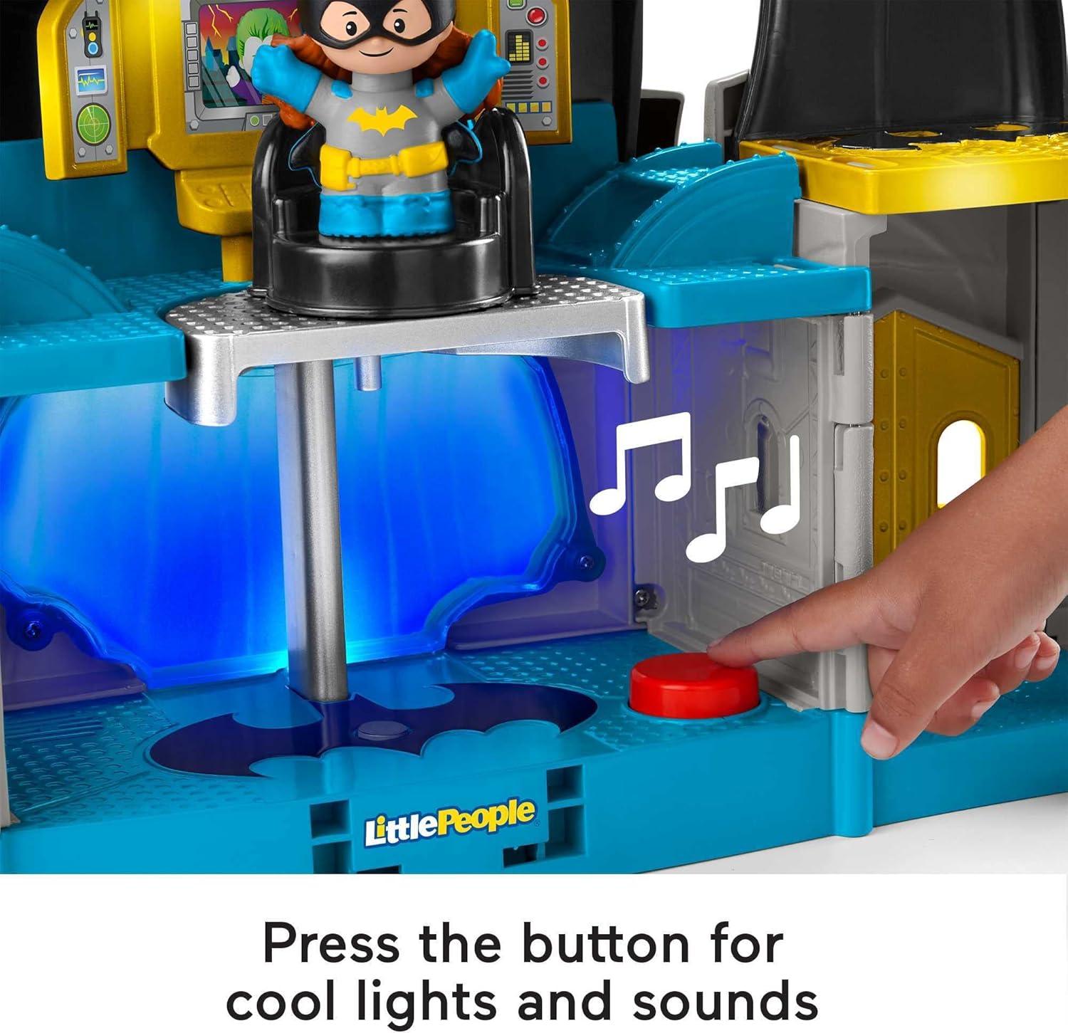 Young crimefighters can act out their own fun Super Hero stories with this Little People DC Super Friends Deluxe Batcave playset. The Joker is up to no good, and it’s up to Batman and his friends, Robin and Batgirl, to save the day! As kids explore the playset, cool lights, sounds and character phrases bring the pretend play to life. With 4 figures, 2 push-along vehicles and a Batcopter play piece, this Little People play set is a great gift for any young DC Super Friends fan!
