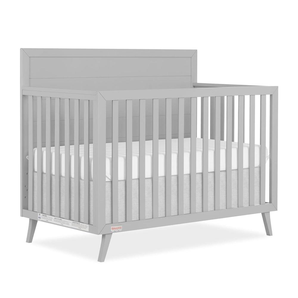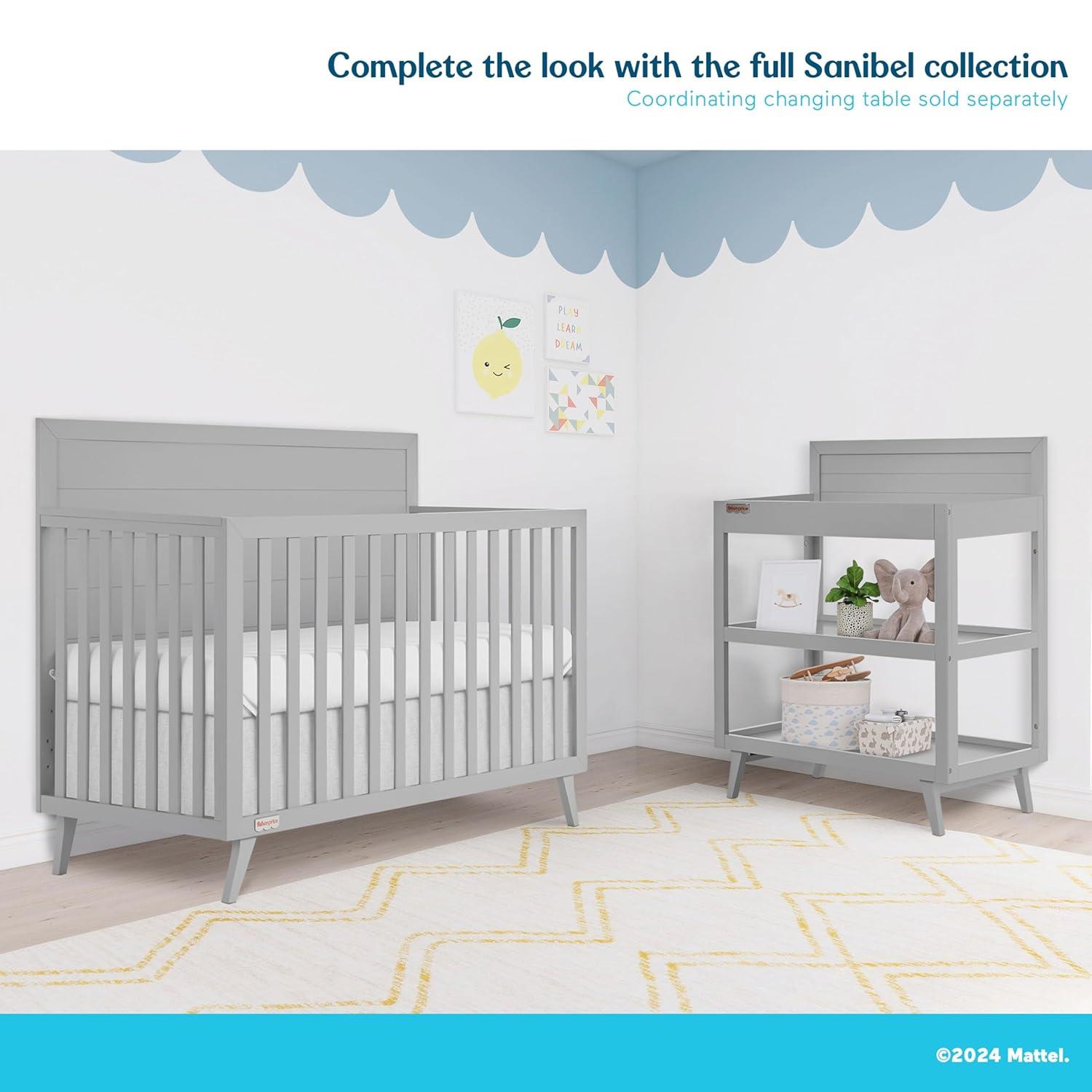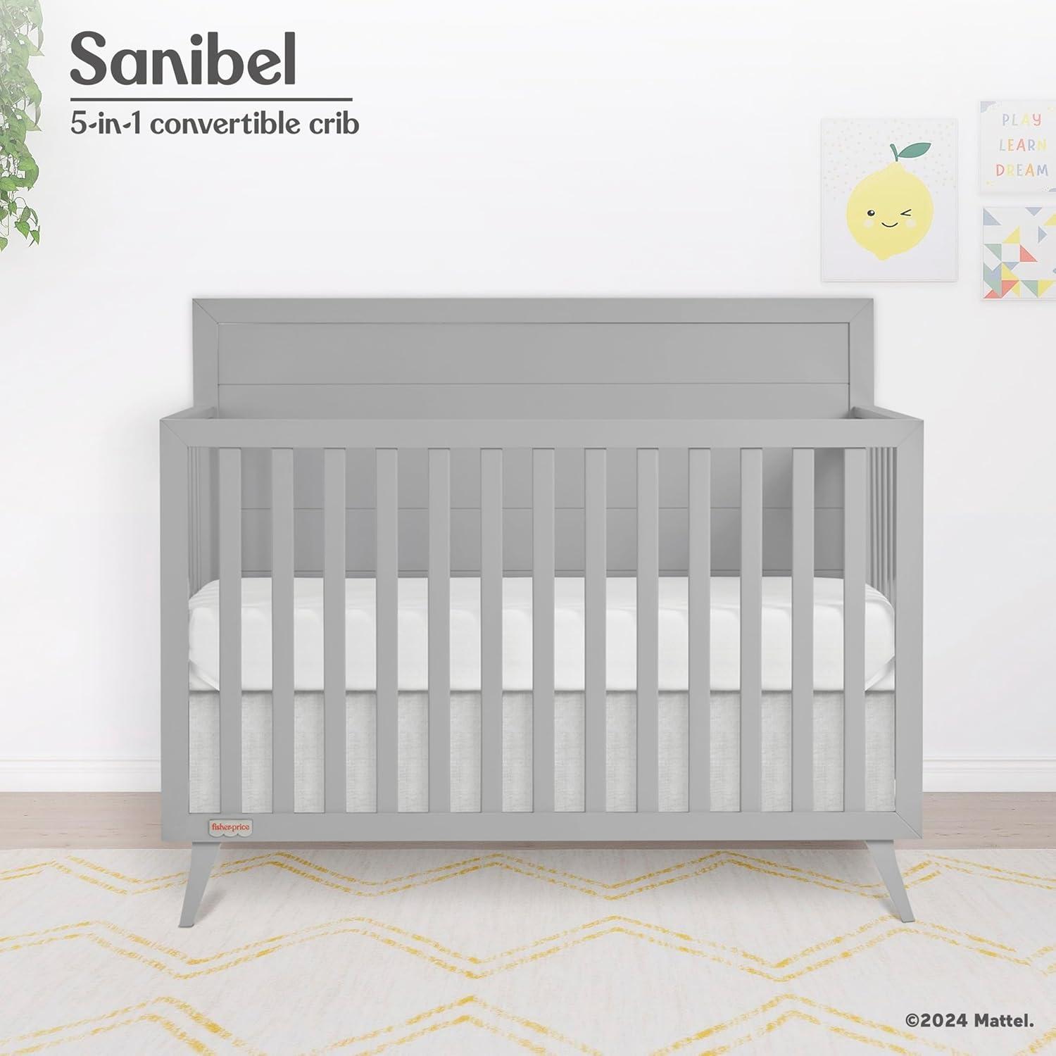 Dream On Me Fisher-Price Sanibel 5-in-1 Convertible Full-Size Baby Crib in Pebble Grey, GreenGuard Gold, Sustainable Pinewood, Wooden Spindles, 3 Mattress Heights, Converts to Day & Toddler Bed