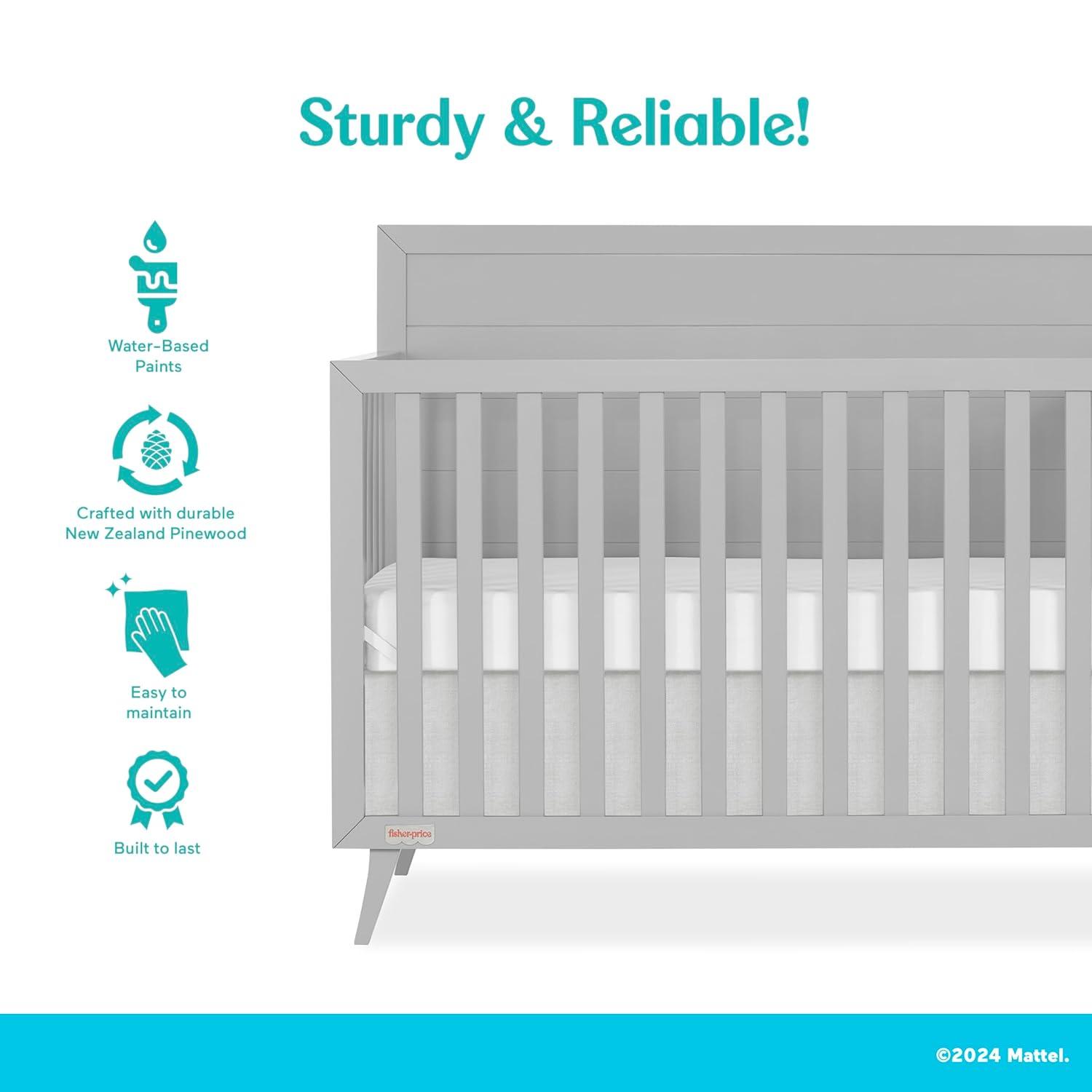 SAFETY FIRST, ALWAYS: Adhering to the strictest safety standards, the Fisher-Price by Dream On Me Sanibel 5-in-1 Convertible Crib is JPMA & Greenguard Gold certified and meets/exceeds the ASTM and CPSC standards.