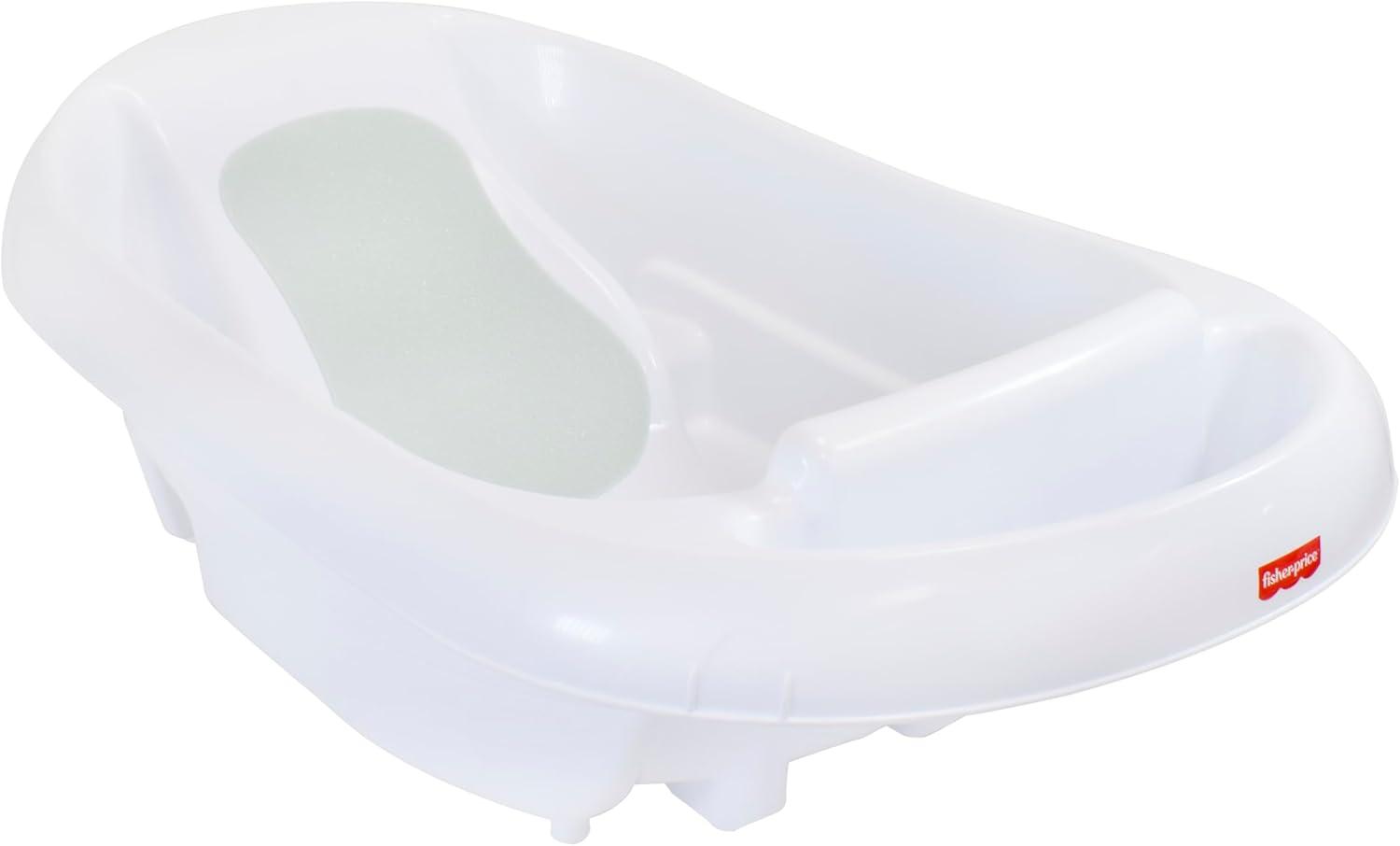 Make bath time easy with the Fisher-Price™ Newborn to Toddler Bath! This adorable white tub grows with your child through three developmental stages, adapting from newborn to infant to toddler and all the splashes in-between. The soft mesh sling cradles your newborn to provide them with extra comfort and support during bath time. When they outgrow the sling, this bath also provides reclining support with soft foam until they can sit up on their own! Fits in single and double sinks with added storage at the base for bath supplies. When bath time is over release the plug to quickly drain the bath water.