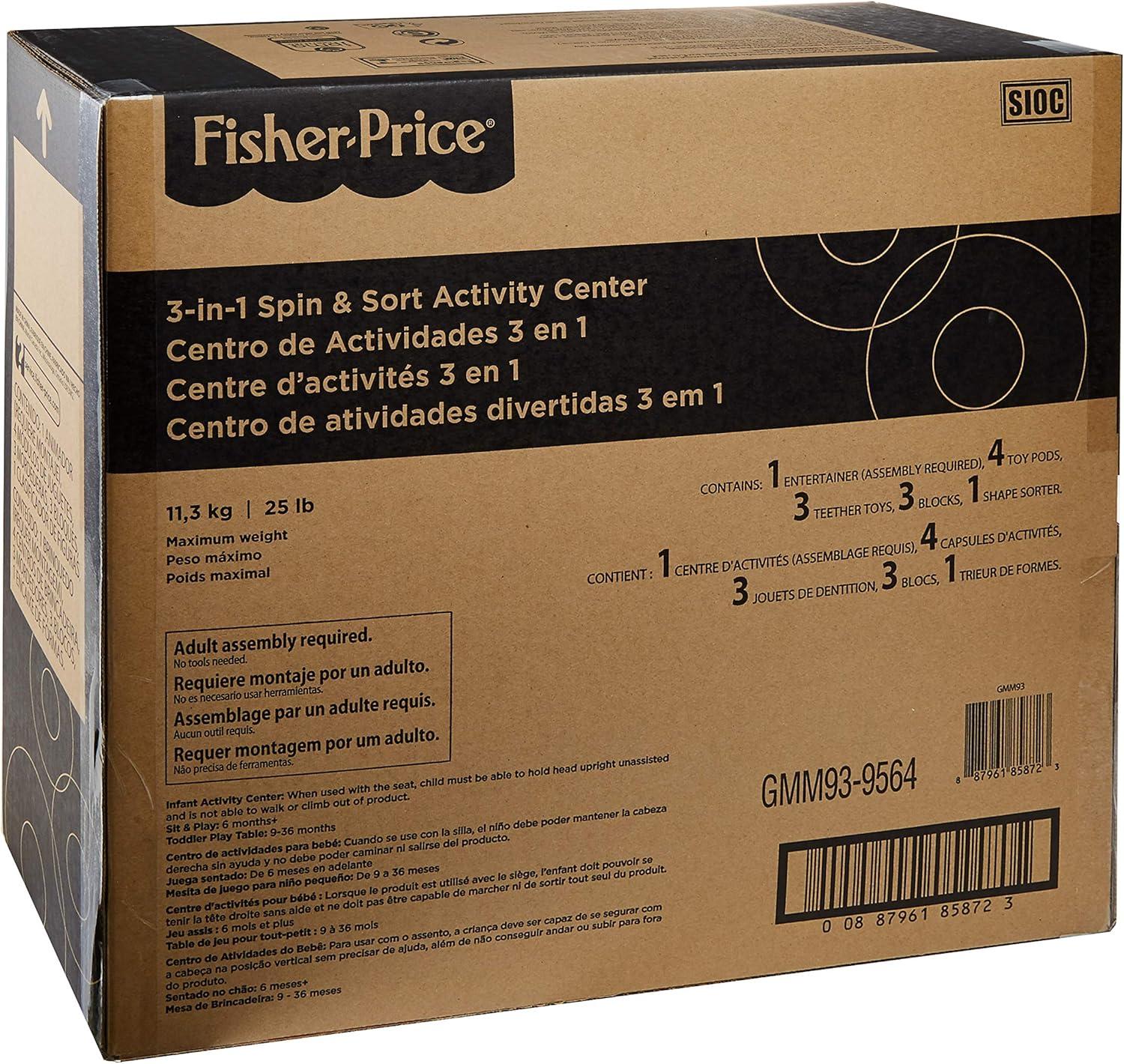 The Fisher-Price 3-in-1 Spin & Sort Activity Center keeps playtime going as your baby grows from infant to toddler! It starts as a sit-in infant entertainer with a spinning seat and moveable activity pods for 360 degrees of hands-on play. Then, as your baby grows, you can snap the activity pods to the shape-sorter plate, so your baby can explore as they sit up on the floor. And when your toddler is ready to stand up and walk around, swap out the seat for the shape-sorter plate and the activity center becomes a toddler play table! This convertible activity center is loaded with customizable play to keep your growing explorer entertained day after day. When used with the seat, child must be able to hold head upright unassisted and is not able to walk or climb out of product. Max. weight 25 lb/ 11,3 kg.