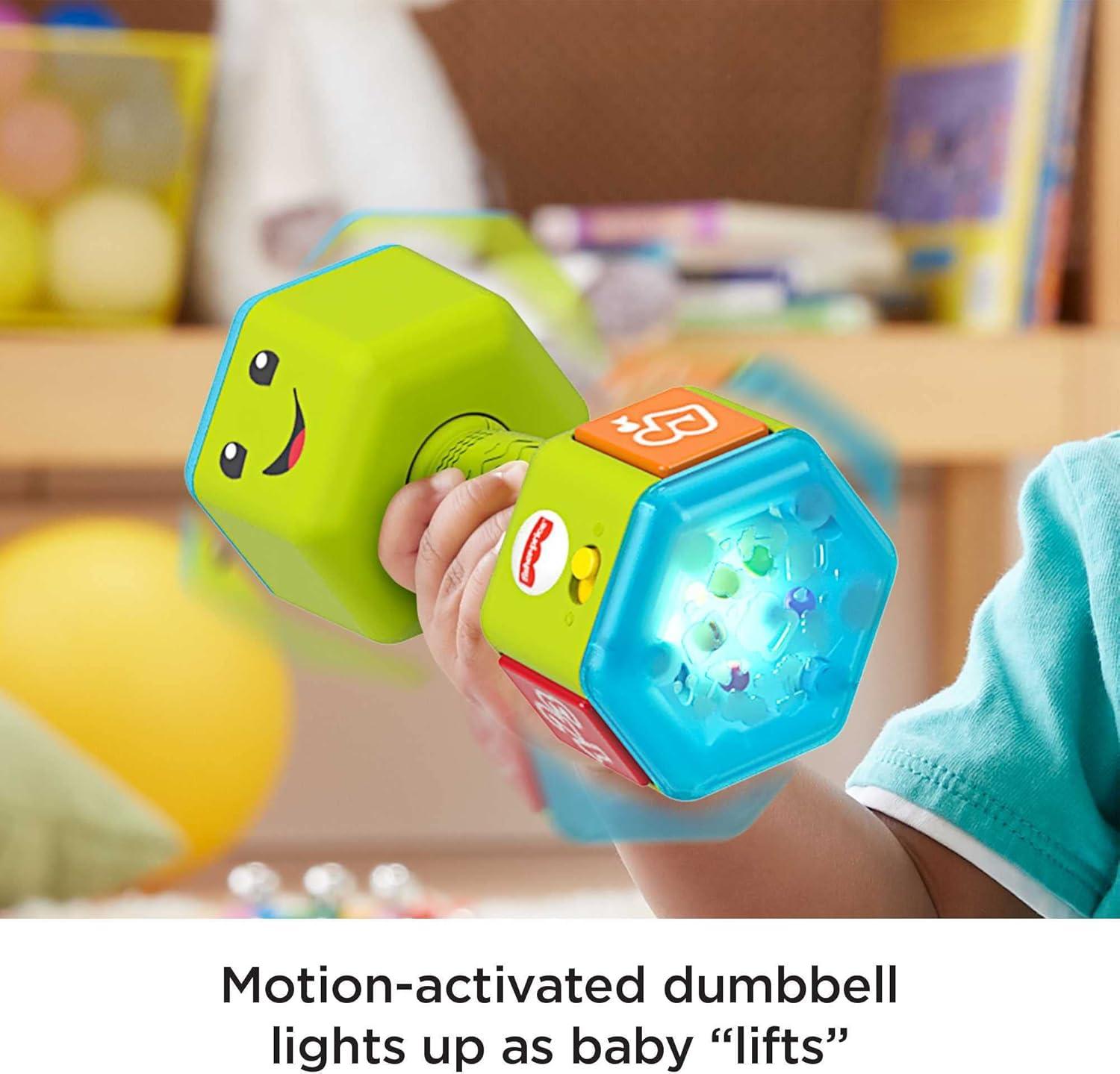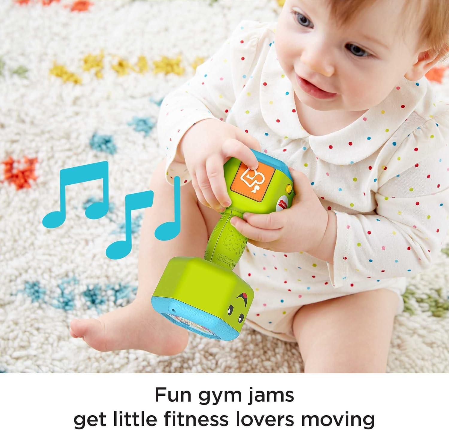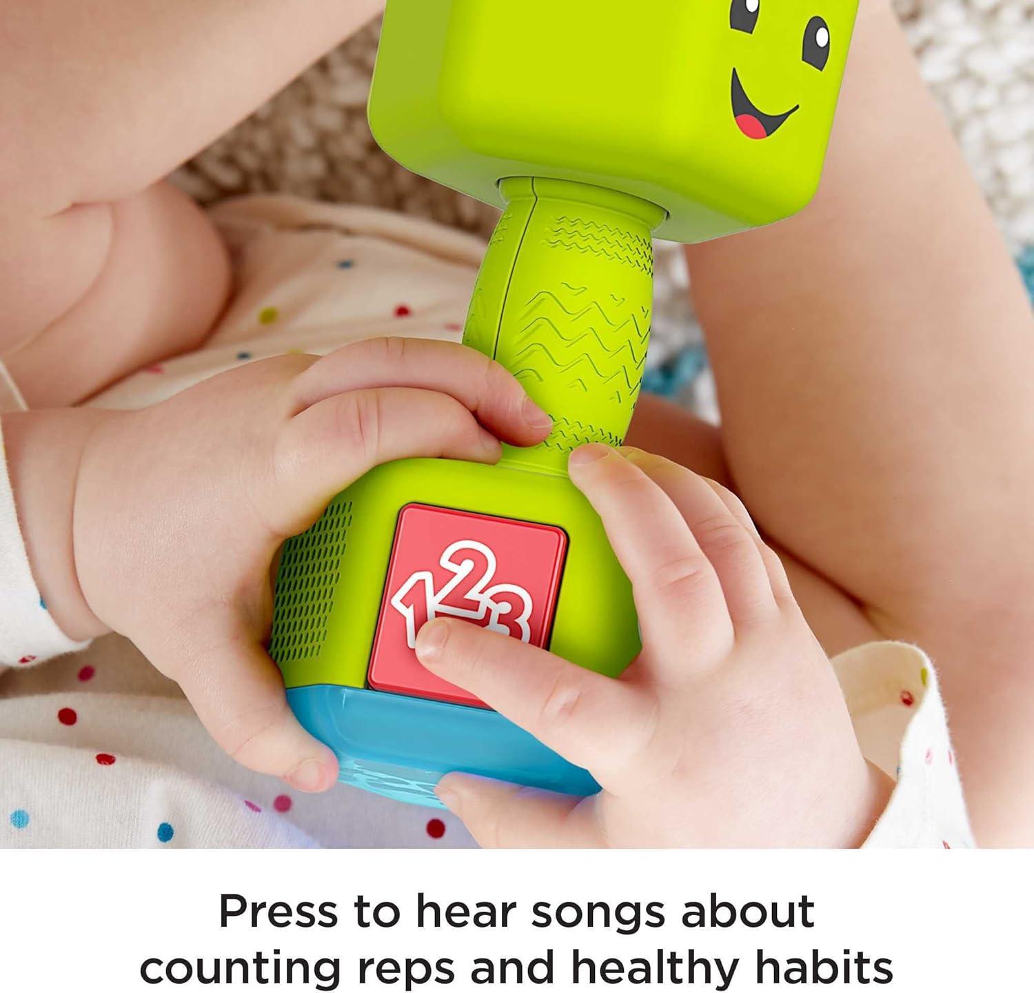 Pretend dumbbell baby toy that plays learning songs, sounds, and colorful lights for early role-play fun