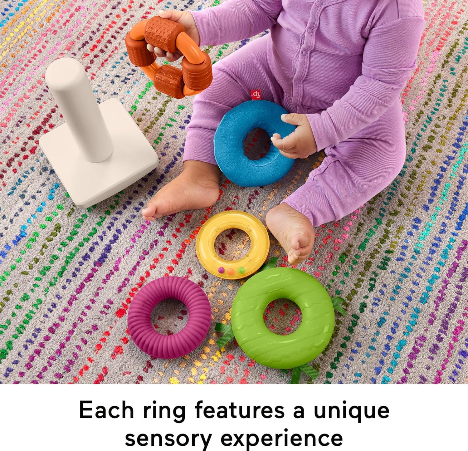 The Sensory Rock-A-Stack toy from Fisher-Price adds a fresh element of fun to this classic roly-poly stacking toy. Each of the 5 colorful rings features different textures, fabrics and taggies to engage and delight your baby’s senses. Babies will love touching, grasping, shaking and stacking the rings on the wibbly-wobbly base, exercising their fine and gross motor skills as they do!