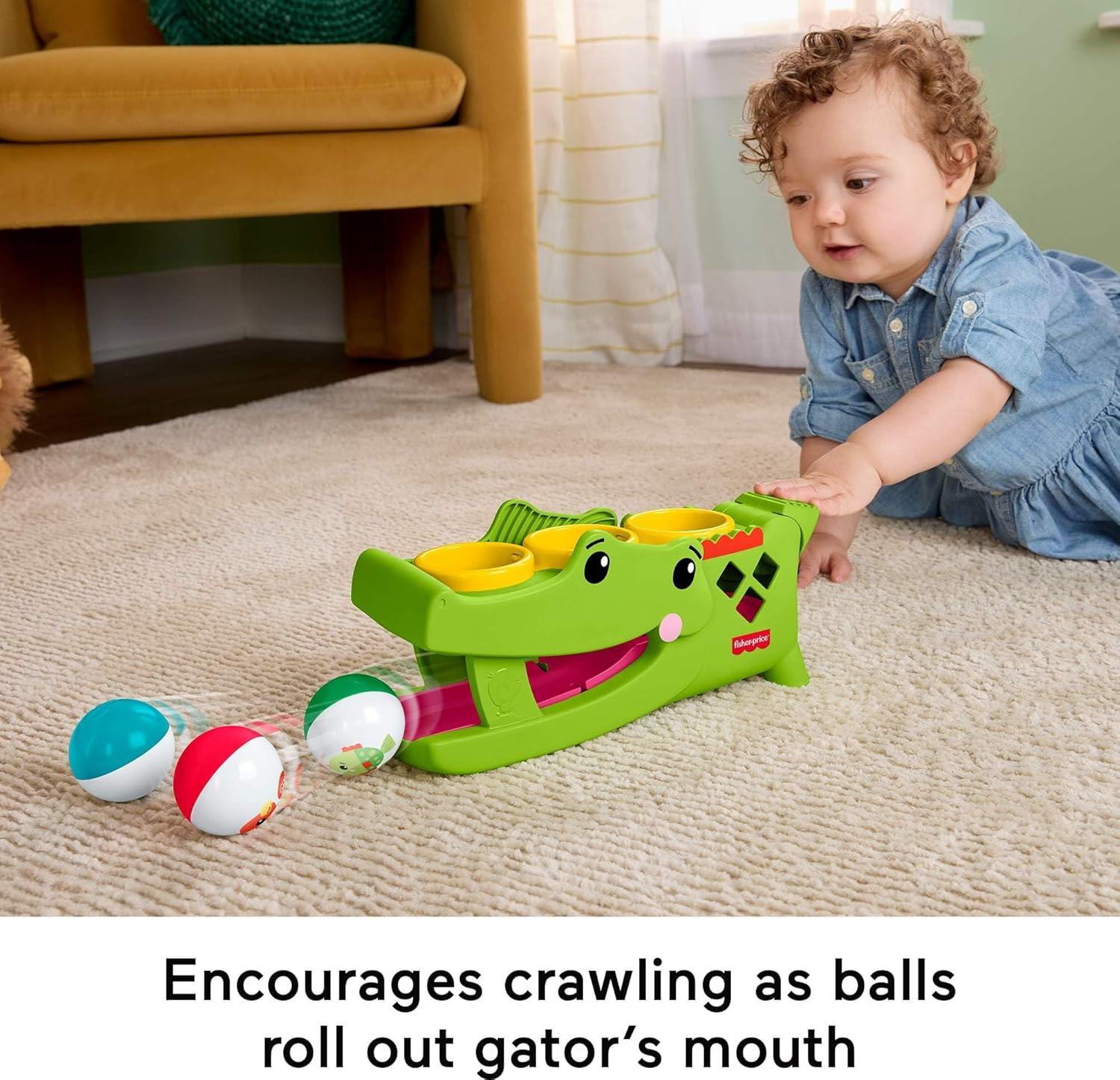 Crawl & chase play: Push the tail to open Rolligator’s mouth and send the balls rolling all over, encouraging your baby to crawl after them