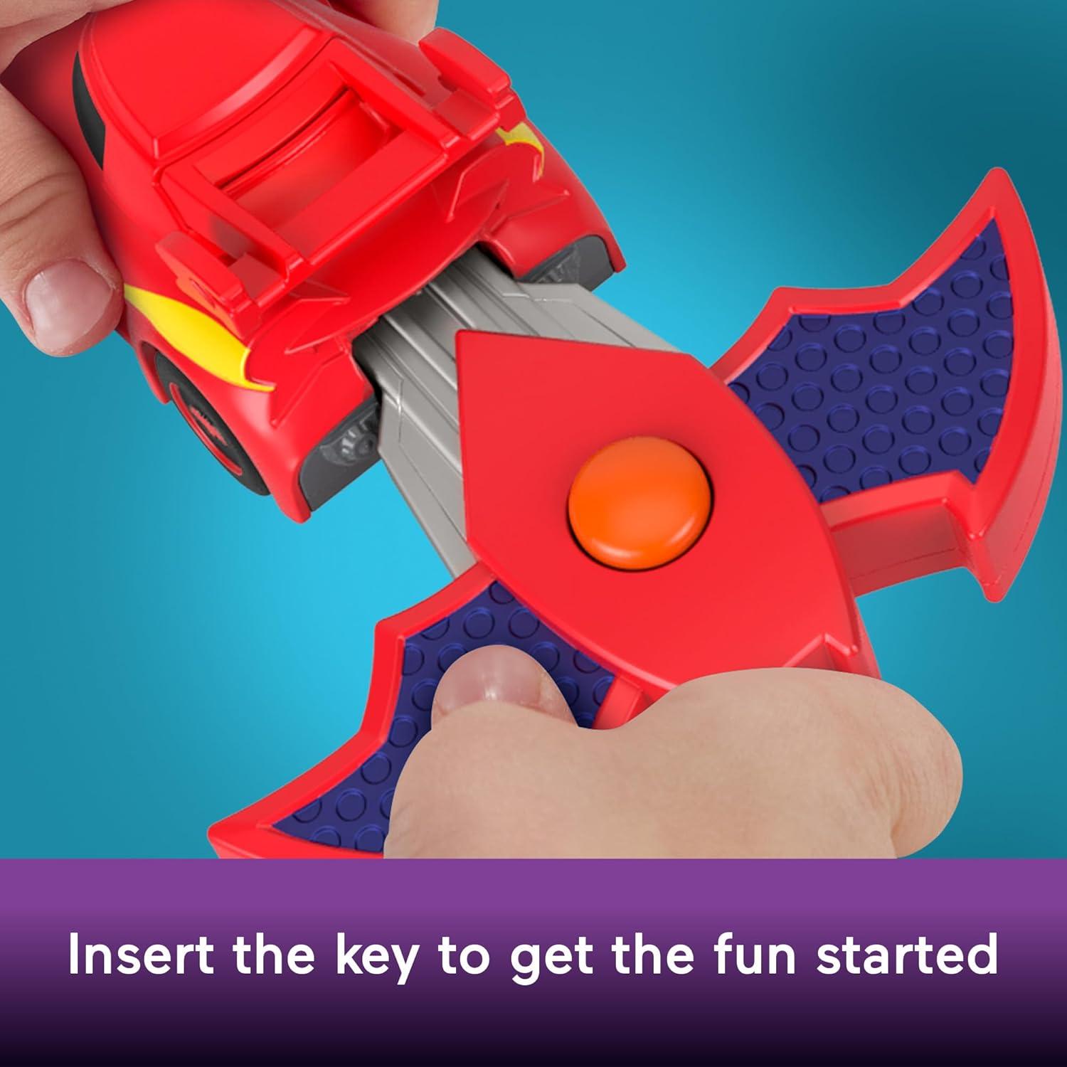 Insert the activating key into the back of the vehicle and press the button to launch the Batwheels character into action