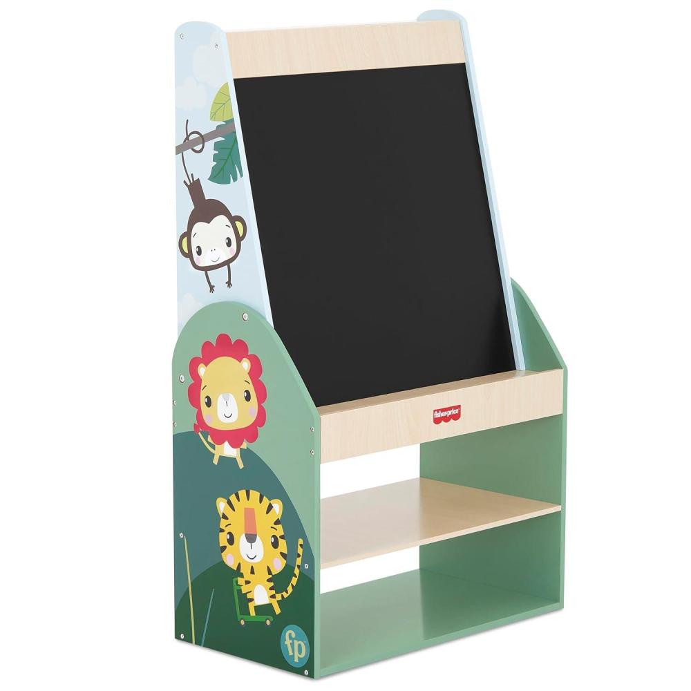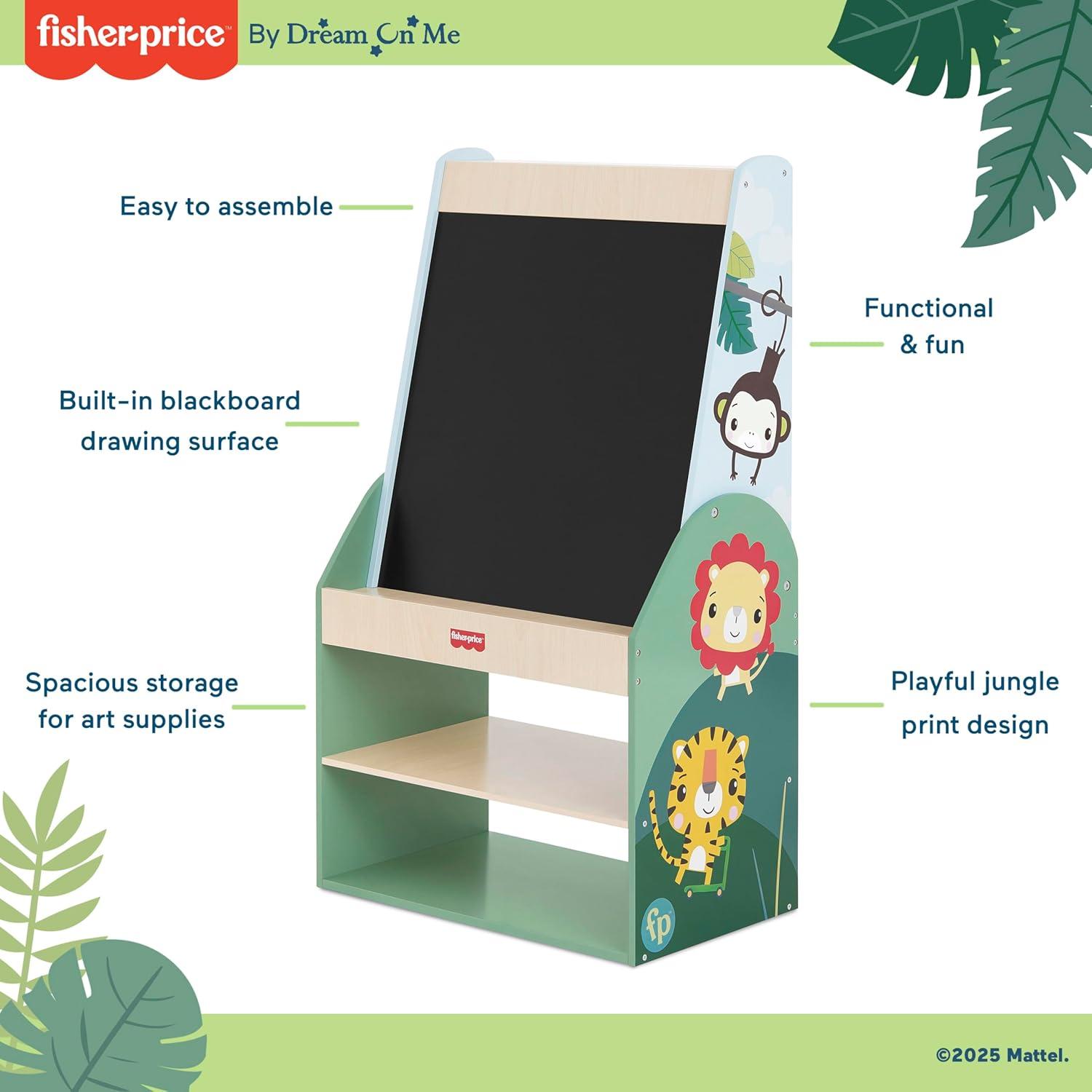 Unleash your child's creative spirit with the Fisher Price Fauna Collection Wild Wonder Artist Center by Dream On Me! Inspired by the vibrant colors and playful creatures of the jungle, this artist center is a must-have addition to any budding artist’s creative space. Safety comes first, and the Wild Wonder Artist Center meets/exceeds ASTM standards to ensure worry-free creativity for your little one. Let your child's imagination take center stage with the built-in blackboard drawing surface. Perfect for doodling, sketching, and scribbling, it provides endless opportunities for artistic expression and storytelling. Keep art supplies organized and easily accessible with the two spacious shelves below. Whether it's crayons, markers, or paint brushes, there's plenty of room to store all the tools of the trade. With its jungle-inspired design and practical features, the Wild Wonder Artist Center encourages children to explore their creativity and express themselves freely. Product dimensions are 23.11” L x 13.66 “ W x 40.16” H.