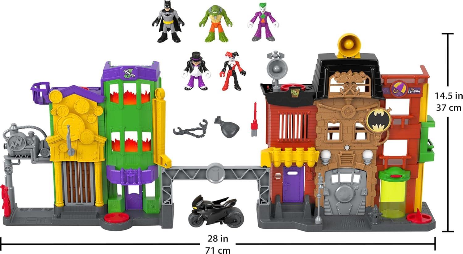 Young crime-fighters can bring all the awesome Gotham City action to life at home with this Imaginext DC Super Friends Crime Alley playset from Fisher-Price. The Joker and his fellow Super-Villains Harley Quinn, Killer Croc and The Penguin have long been wreaking havoc in Gotham City from their hideouts in Crime Alley. Now, Batman takes the battle to them, racing into action on his Batcycle to clean up the streets for good. Young crime-fighters will have a blast plotting and scheming with their favorite Super-Villains and then reversing roles to help the Caped Crusader save the day!