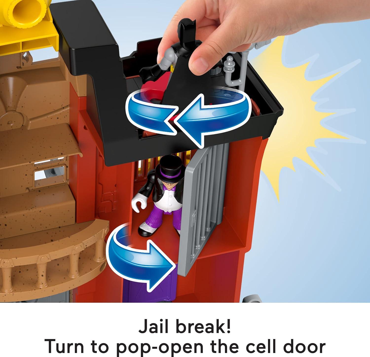 Playset features multiple Super-Villain secret lairs, a bank vault that opens, working elevators, pop-up green 'flames' and a jail cell