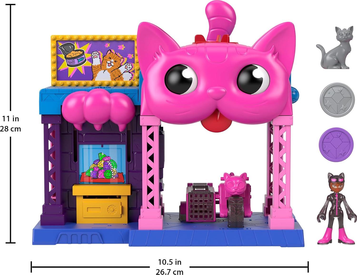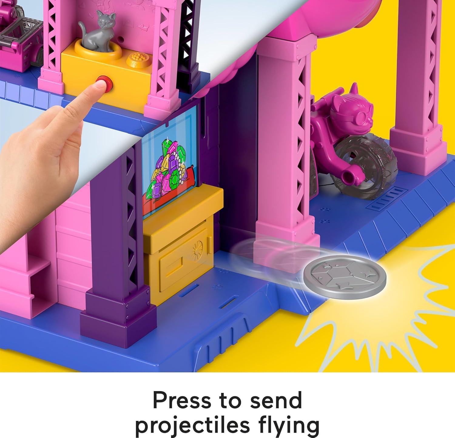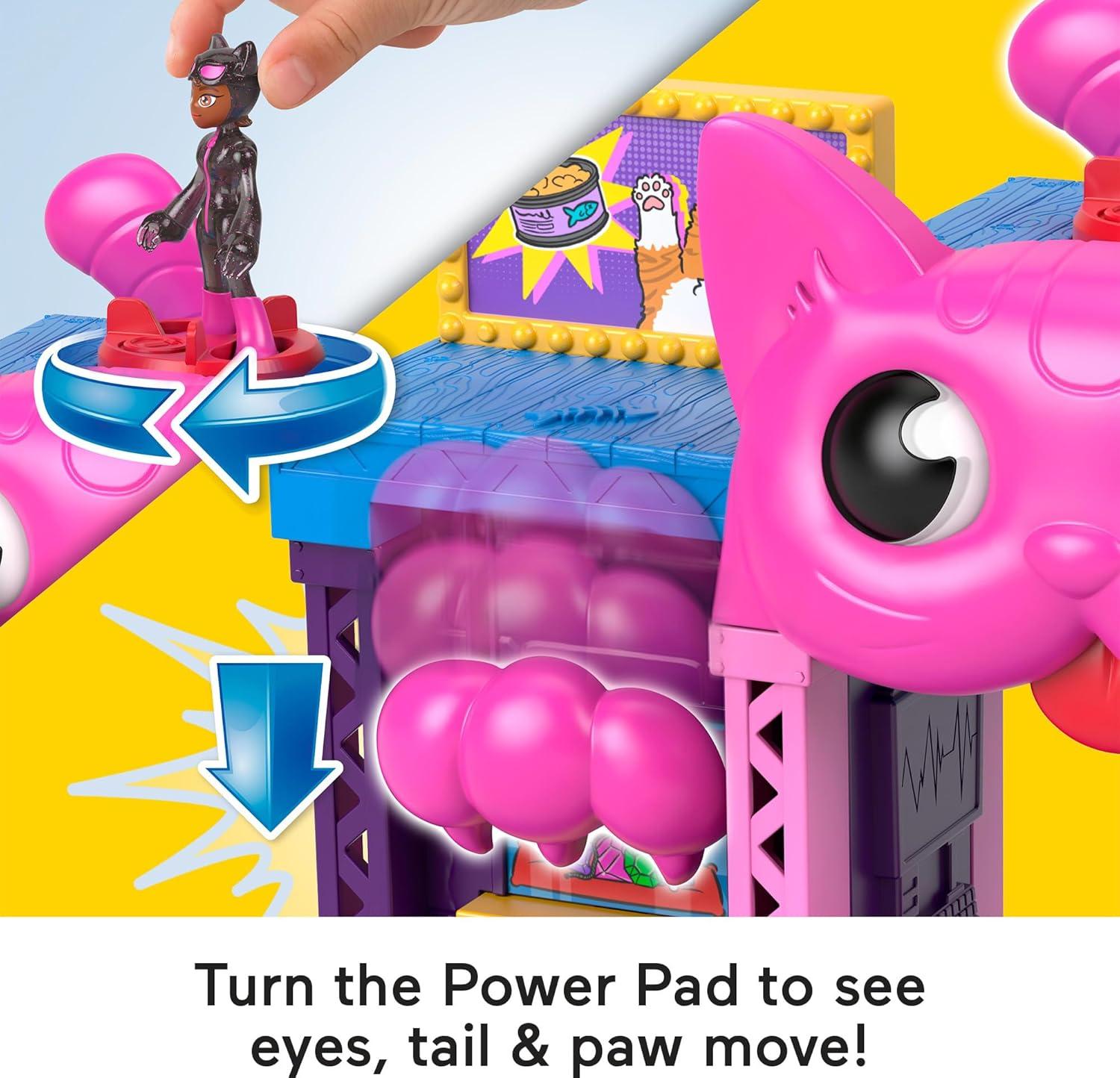 Preschool kids can act out purr-fectly mischievous stories with Catwoman and the Imaginext DC Super Friends Catwoman Playhouse playset from Fisher-Price. Kids can bring the fur-ocious action to life by turning the Power Pad to see the giant cat eyes move, the tail swing, and the paw drop down to knock over intruders. There’s even a projectile launcher in case Batman comes to play. (Additional figures sold separately.) Playset comes with a Catwoman poseable figure, Cat Cycle, 2 projectile discs, and a cat play piece. Colors and decorations may vary.