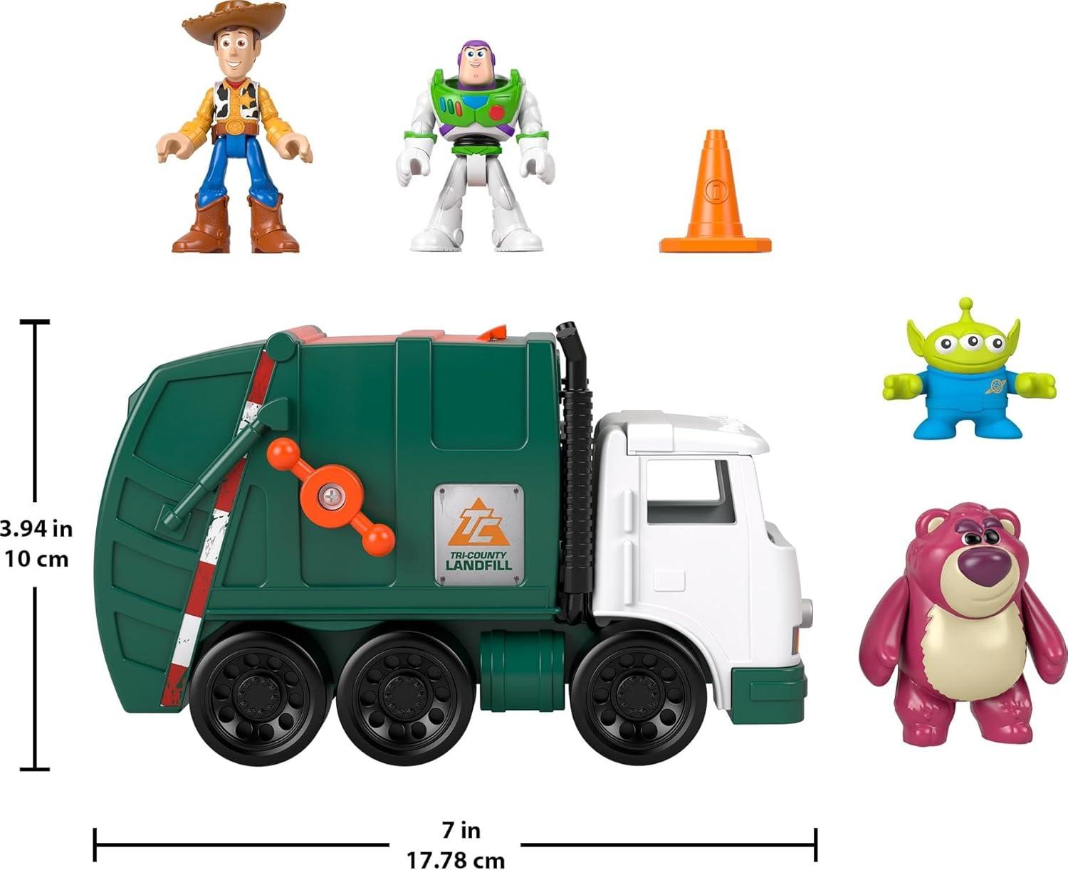Kids can recreate one of the most thrilling scenes from Disney and Pixar Toy Story 3 with the Imaginext Garbage Truck Playset. Endless adventures await with 3-inch action figures of fan-favorite characters – Woody, Buzz Lightyear and Lotso, plus one of the Aliens who wants in on the fun! Kids can place the Alien figure on the top of truck and use the handle to have the garbage truck swallow him up and spit him back out! Lotso figure also attaches to the front of the truck, just like in the Toy Story films! The classic traffic cone accessory adds to the storytelling fun. Colors and decorations may vary.