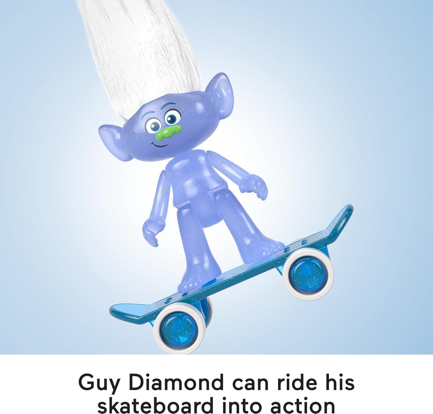 Guy Diamond rolls into action on his skateboard; Branch’s roll-along sparkly motorcycle has spinning flowers; push Poppy on her roll-along hoverboard to see the flower spin
