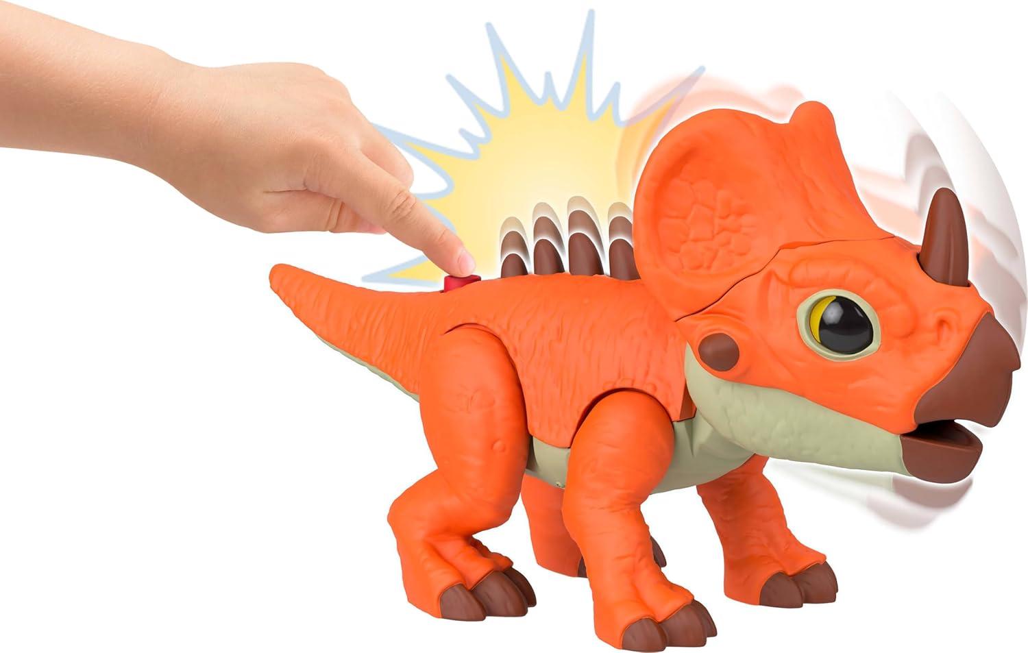 Easy-to-use mechanisms control the action — push a button to launch the net or extend the spikes on the Aquilops figure's back and use the button to activate the T. rex's chomp!