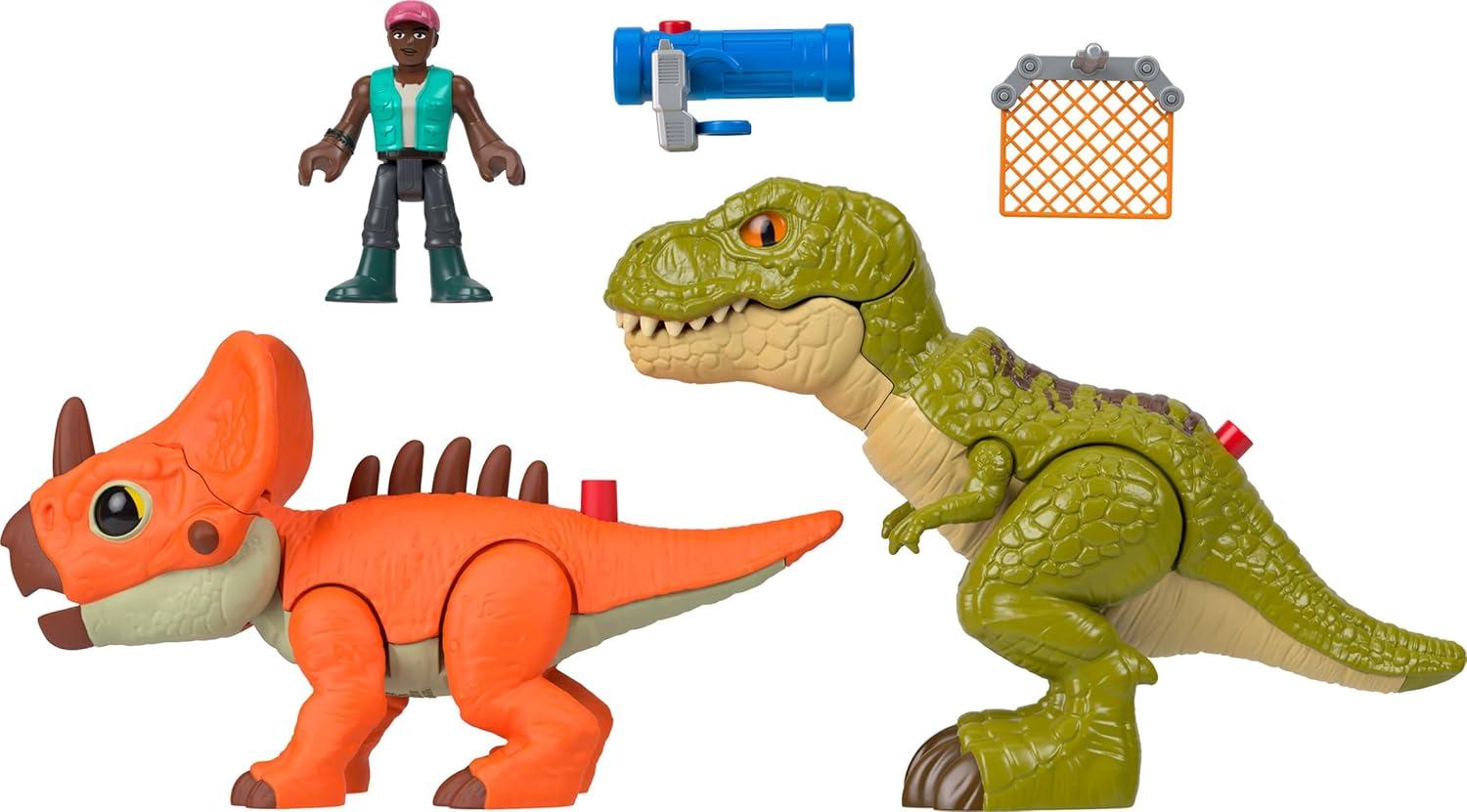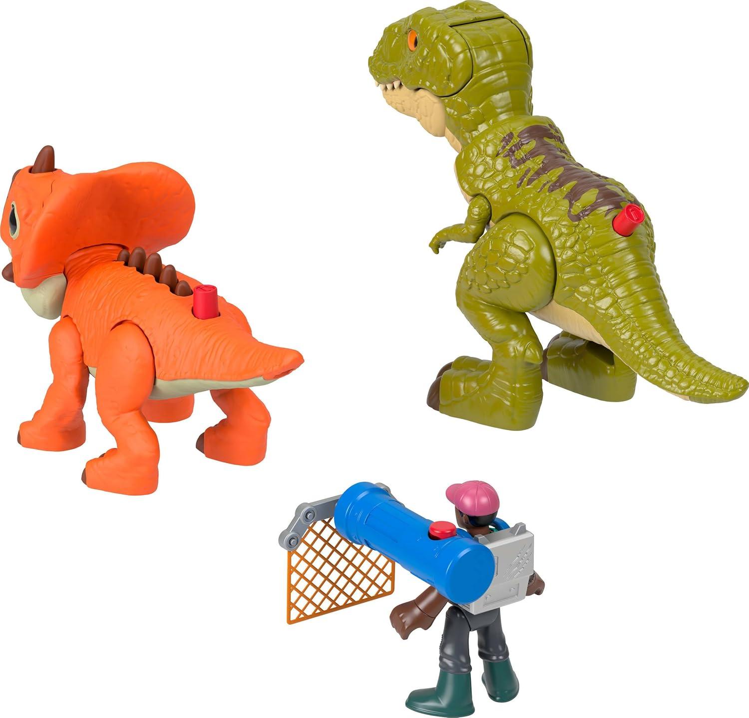 Young Jurassic World fans can bring the action home with the Imaginext T. rex Gift Pack by Fisher-Price. This playset comes with two dinosaur figures, one 3-inch human action figure with launcher and projectile. Young adventurers can roam into imaginative play with easy-to-hold figures and kid-activated action. Kids simply push the button on the Aquilops figure to extend the spikes on its back or use the button on the T. rex to open its mouth and activate a chomping feature. Dinosaur lovers will roar with joy when they touch the real feel heads of each dinosaur. Fans ages 3 years old and up can reenact scenes from Jurassic World Rebirth or imagine new adventures of their own. Colors and decorations may vary.