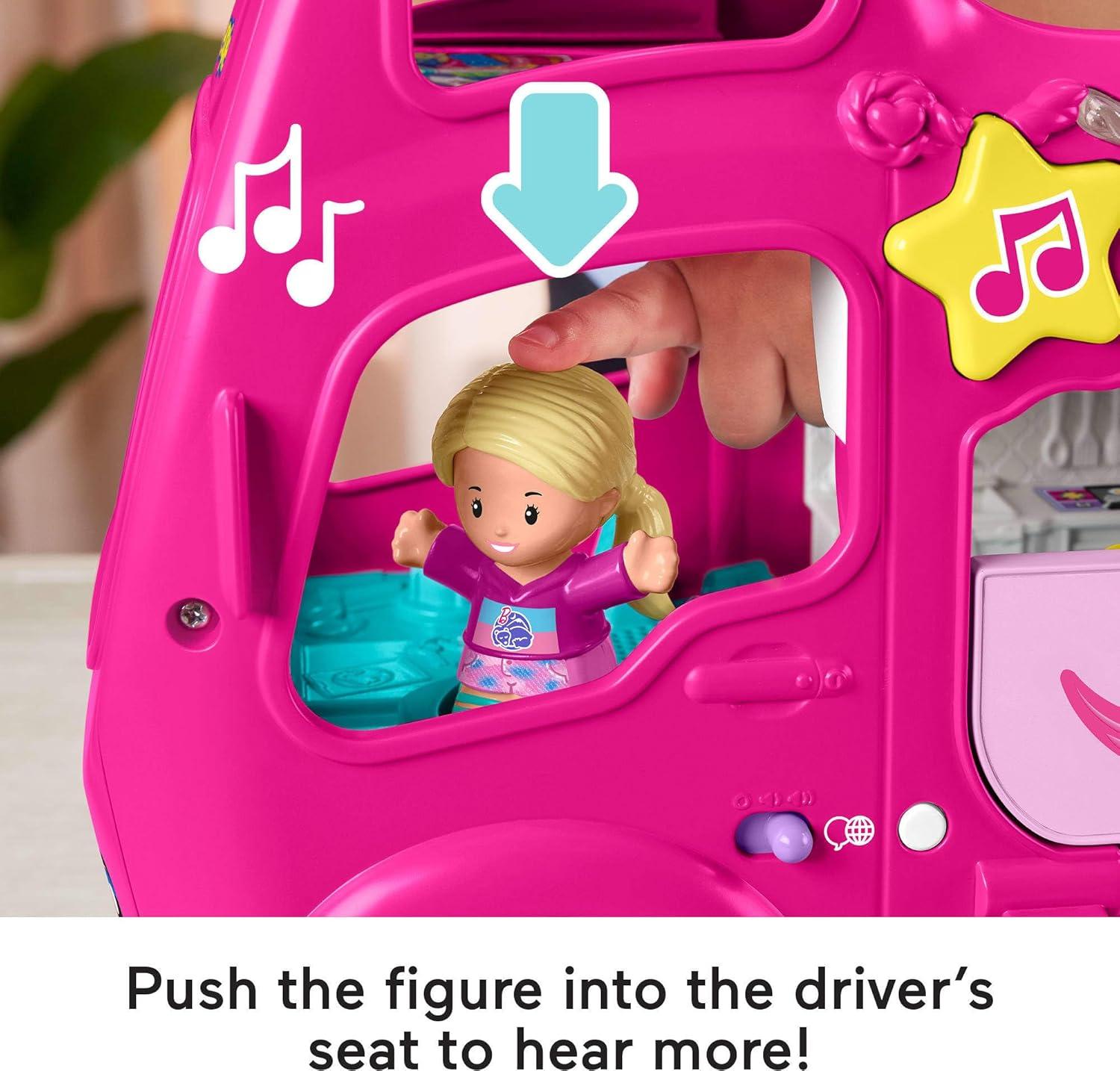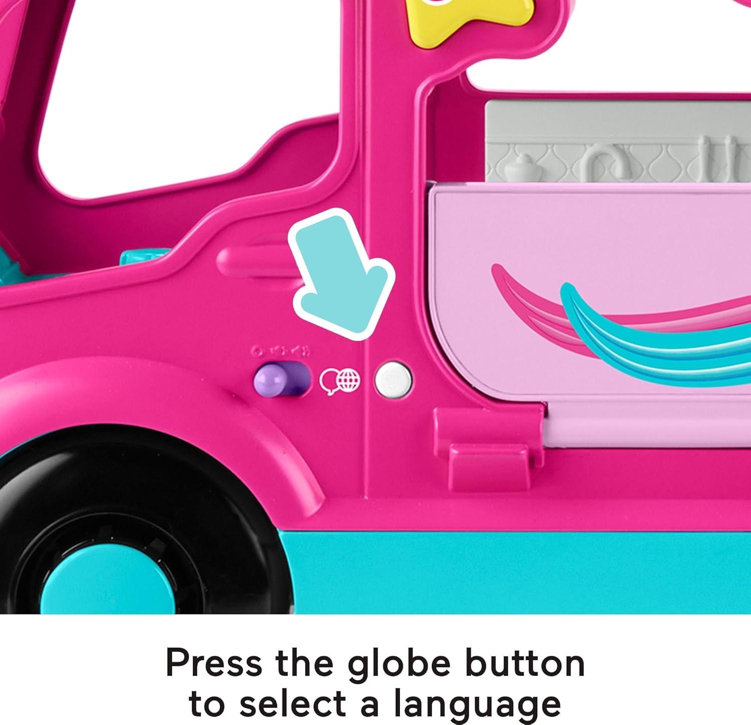 Young Barbie fans can hit the road for new adventures with the adorable Barbie Little Dreamcamper by Little People. This combination push-along camper and toddler playset includes 2 Little People figures and 3 camping-themed play pieces to enhance their storytelling play. Toddlers can cruise to the “campsite” and start the fun with 35+ songs, sounds and phrases that activate when kids press a figure into the driver’s seat or push the star button. With classic camper features and camping accessories, this push-along RV and playset will spark your little one’s imagination for hours on end. Use the globe button to select a language: English, Spanish, French or Brazilian Portuguese.