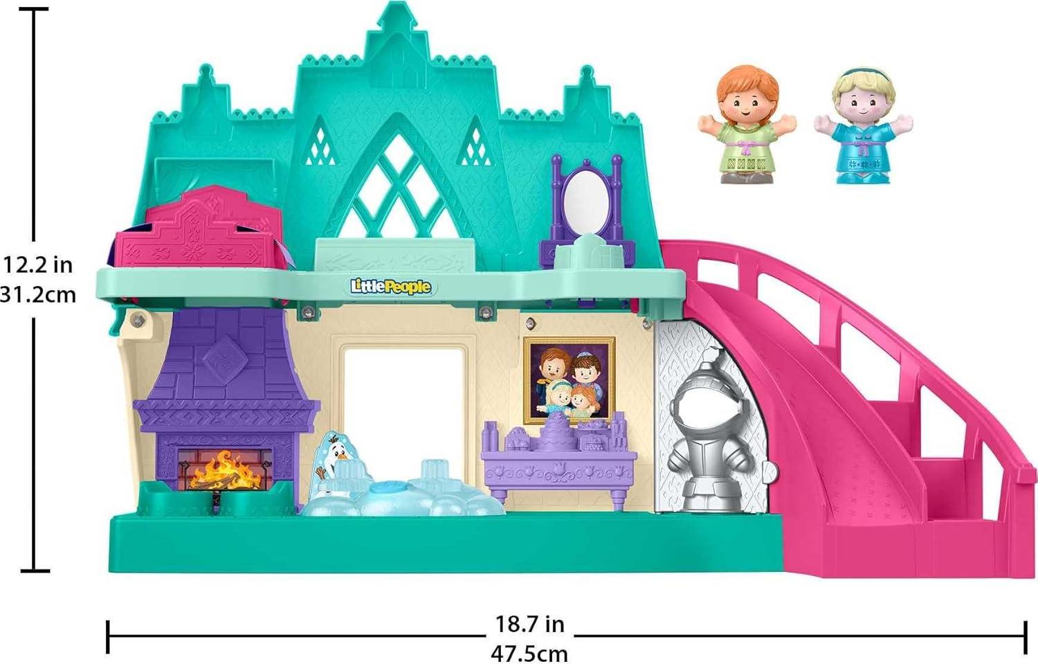 Young fans can create their own fun stories with Disney Frozen Anna and Elsa at the Arendelle Castle playset by Little People. This movie-inspired playset features two floors of play for kids to explore, including a “snow pile” that lights up with fun sounds, a cozy pretend fireplace, a peek-a-boo suit of armor, a slide and staircase, and a bedroom with vanity area and bed. Requires 3 AA batteries (not included). Colors and decorations may vary.