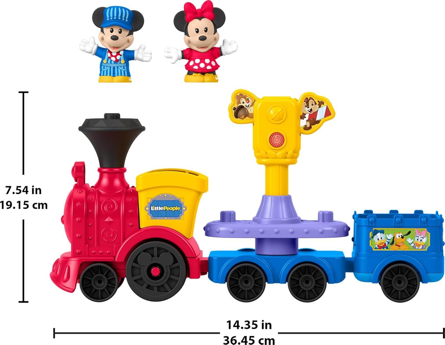 Toddlers can imagine endless adventures with their favorite DISNEY Jr friends, Mickey and Minnie Mouse, with this Little People musical toy train from Fisher-Price. This push-along toy train features fun music and sounds, a passenger car with spinning seats, a pop-up traffic light, and 2 Little People figures styled like DISNEY Jr characters Mickey and Minnie. Kids will love sending Mickey and Minnie rolling along on all sorts of musical journeys! Look for additional Little People figures featuring DISNEY Jr characters to bring to the Mickey & Minnie Musical Train for more ride-along play! (Additional toys sold separately and subject to availability.) Requires 2 AA batteries (included). Colors and decorations may vary.