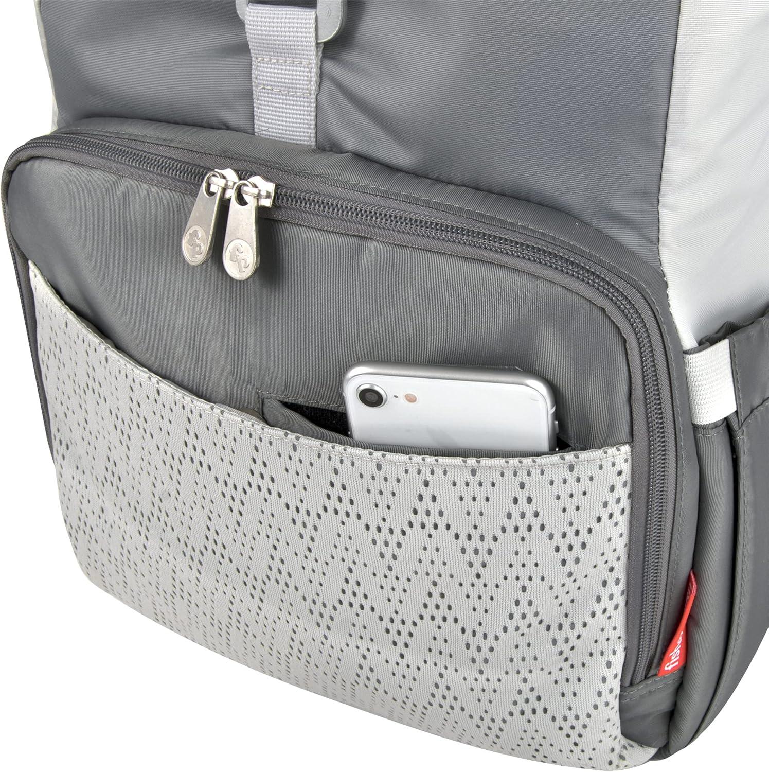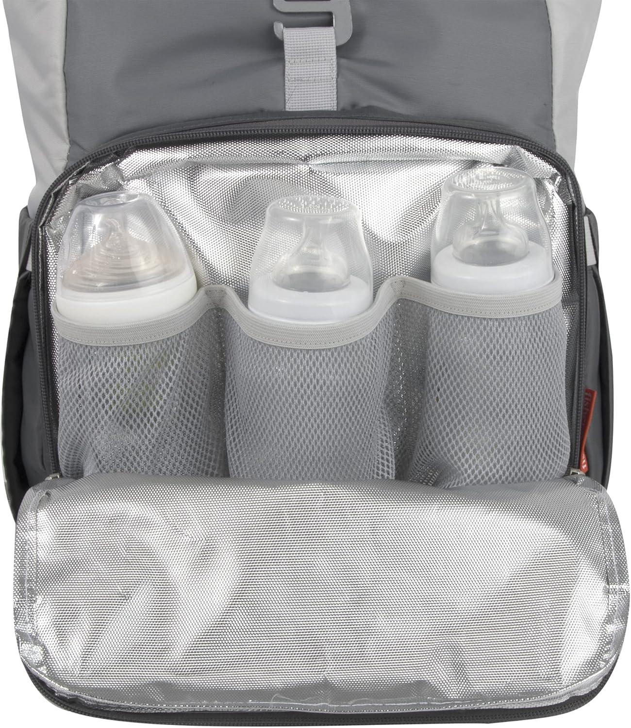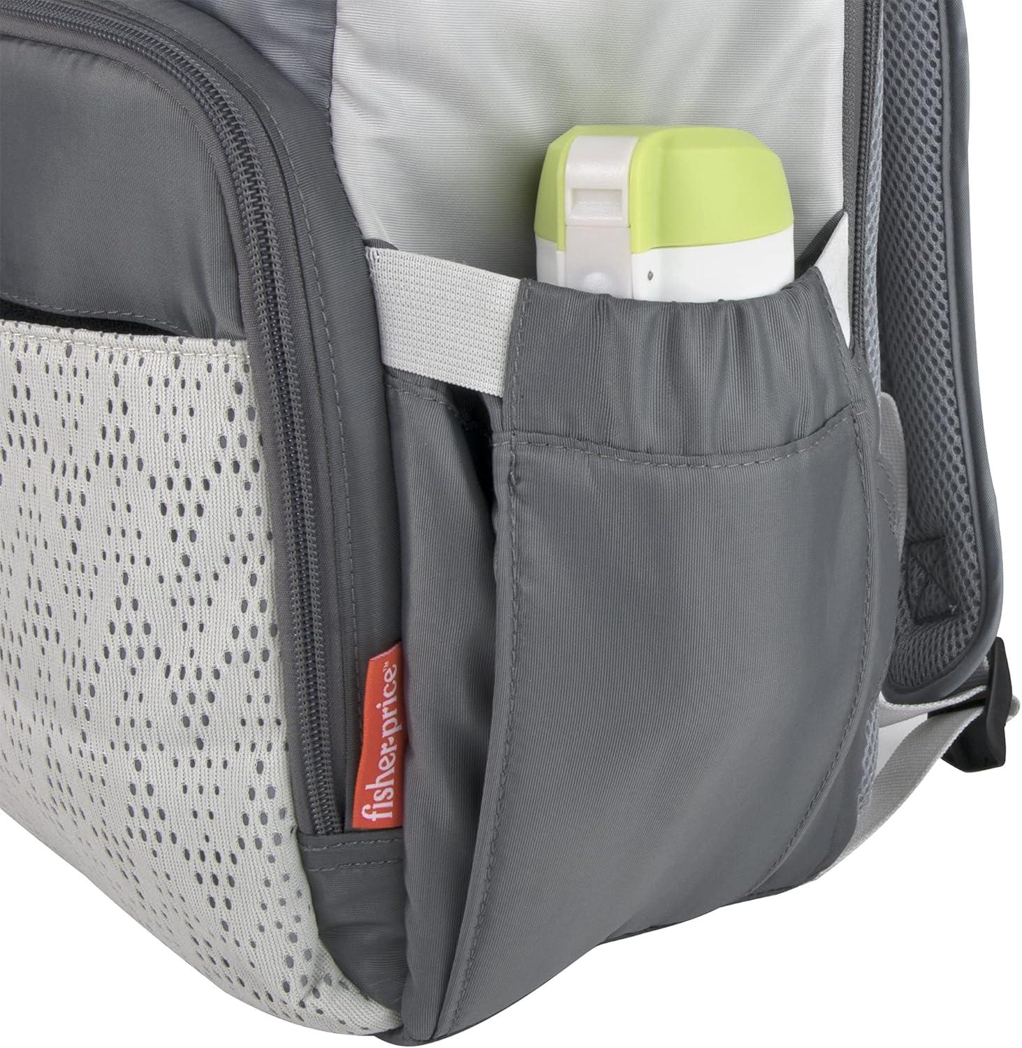 Introducing the Fisher Price Maverick super cooler backpack diaper bag and baby diaper travel bag. This handy infant bag has 13 organization pockets so parents and baby can have it all and do it all. Special features include: 1. Wipe messes away easily in this bag’s interior and from its removable changing pad 2. Handy front cellphone and snacks pockets 3. Large insulated front compartment that holds up to 3 bottles (milk, water, juice). Keeps food, formula, and drinks fresh. 4. Side bottle or wipes pocket for easy 1-handed grabs 5. Adjustable, padded shoulder straps to distribute weight evenly 6. Padded back for comfort 7. Main compartment for everything parents and babies need. Store toys, story books, bibs, teething rings, a change of clothes, medicines, and more! 8. Padded electronics sleeve for laptops and tablets parents need on the go 9. Front Velcro pocket for quick access to your most-needed items. 10. Unique roll top opening with clasp so you can easily access and secure baby’s most precious items anytime, anywhere Fisher Price: The most loved and trusted brand by moms around the world.