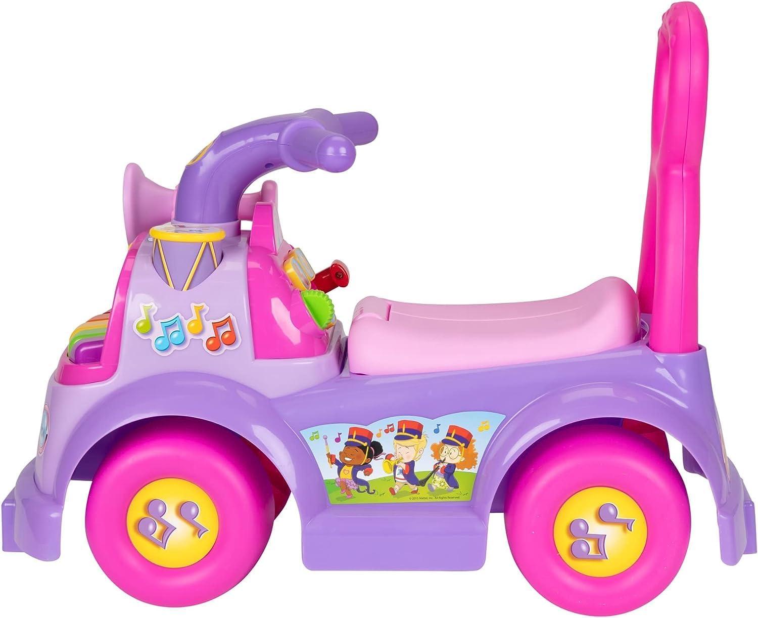So much music! So much fun! Touch the keyboard to hear any of the 5 marching tunes, or switch to play mode to create your own music by pressing on musical instruments. Then press on the trumpet or piano to add to the fun! C'mon the parade is about to begin! Includes 5 different marching tunes. Plus engine start and revving sounds. Under the seat storage is also included. Requires 2 AA batteries (included). For kids ages 1-3 years of age.