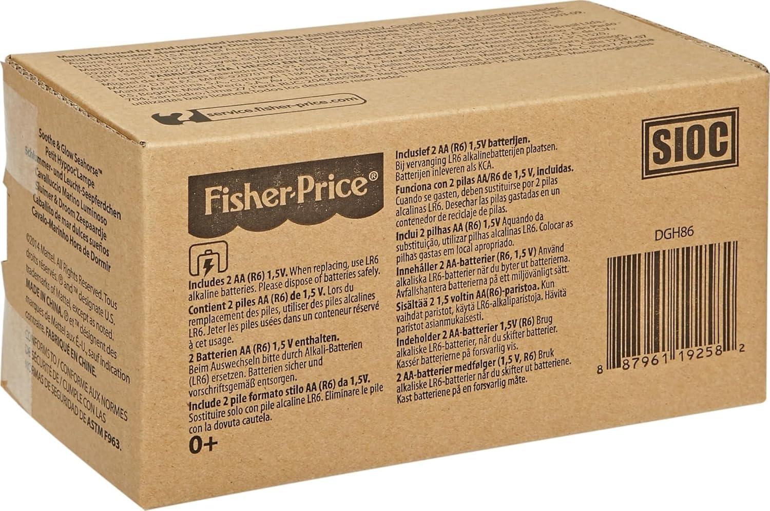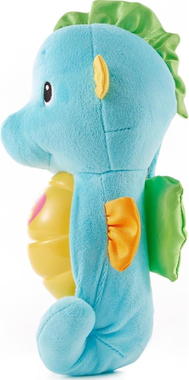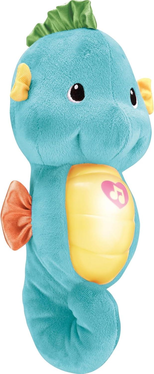 The Fisher-Price Soothe & Glow Seahorse plush musical toy is a soothing cuddle buddy for your baby that lights up and glows as a variety of comforting music and ocean sounds play. Just give the seahorse a gentle squeeze to dive into a relaxing music and light show. Colors and decorations may vary.
