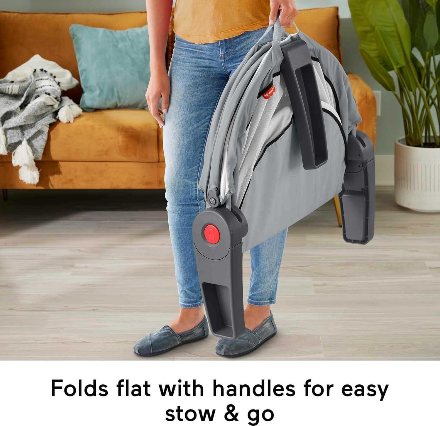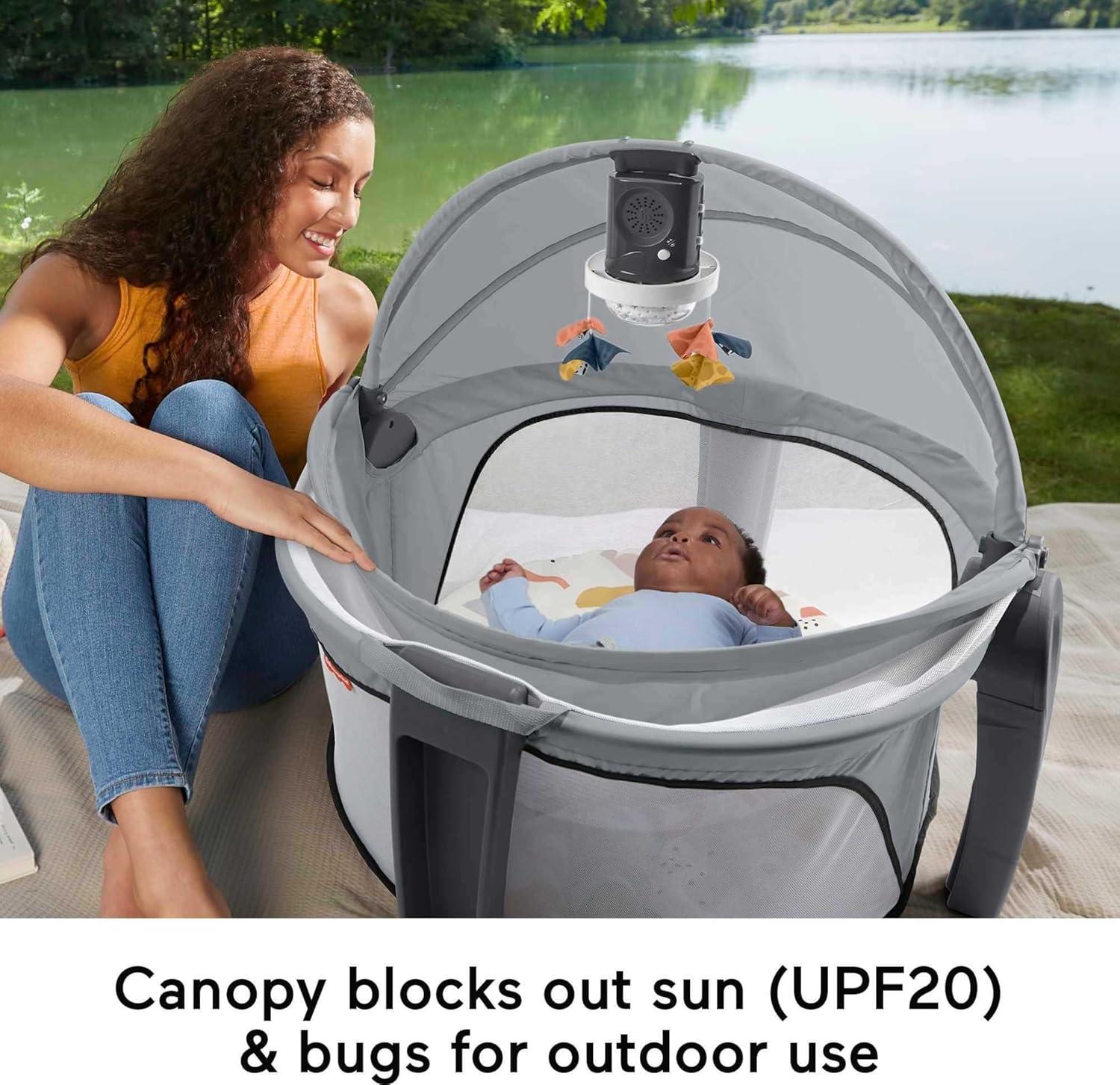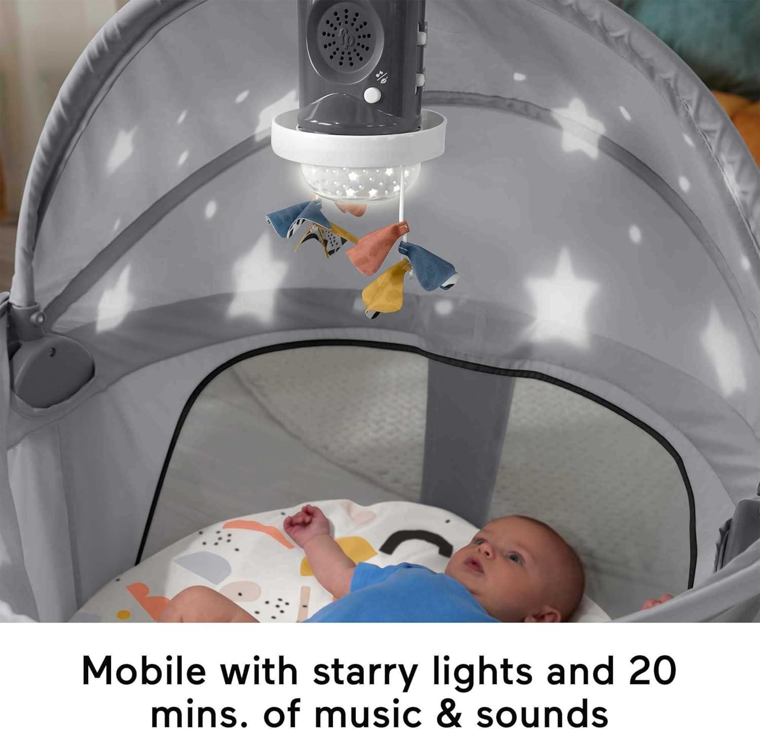 The Fisher-Price Deluxe On-the-Go Projection Dome is a portable nap and play space for your baby that you can use indoors or outdoors, at home or while traveling! This convenient travel dome features a spinning mobile with up to 20 minutes of gentle music and sounds, plus starlight projection, an overhead canopy with UPF20 sun protection and mesh screen to keep the bugs out. Use only with a child who is unable to push up on hands and knees, pull up or sit unassisted.