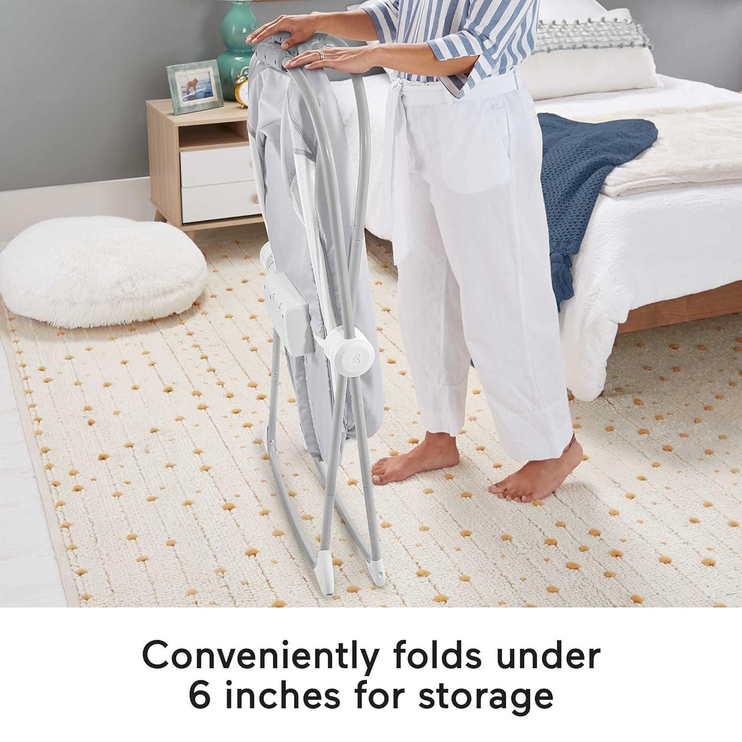 Bassinet has lightweight frame that locks for stationary mode and slim fold (under 6 inches) for travel or storage