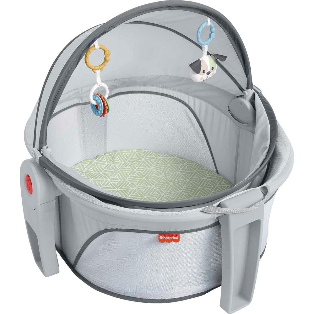 Your baby will feel right at home, wherever you roam, with the Fisher-Price On-the-Go Baby Dome. This 2-in-1 portable bassinet and play space can be used indoors or outdoors with a retractable canopy, breezy mesh sides, soft wipeable pad, and 2 repositionable toys. Plus, the frame folds flat with carry handles to make storage and travel easier. Use only with a child who is unable to push up on hands and knees, sit up unassisted, or grasp side and pull upward.