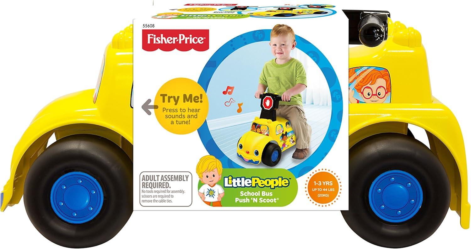 Fisher Price school bus ride-on! This vehicle has all the fun of the classic “little people” School bus! Features include whimsical sound effects and real horn sounds with a push of a button. Comes with extra wide wheels for stability, under seat storage and colorful character graphics. Intended for children 1 – 3 years old.
