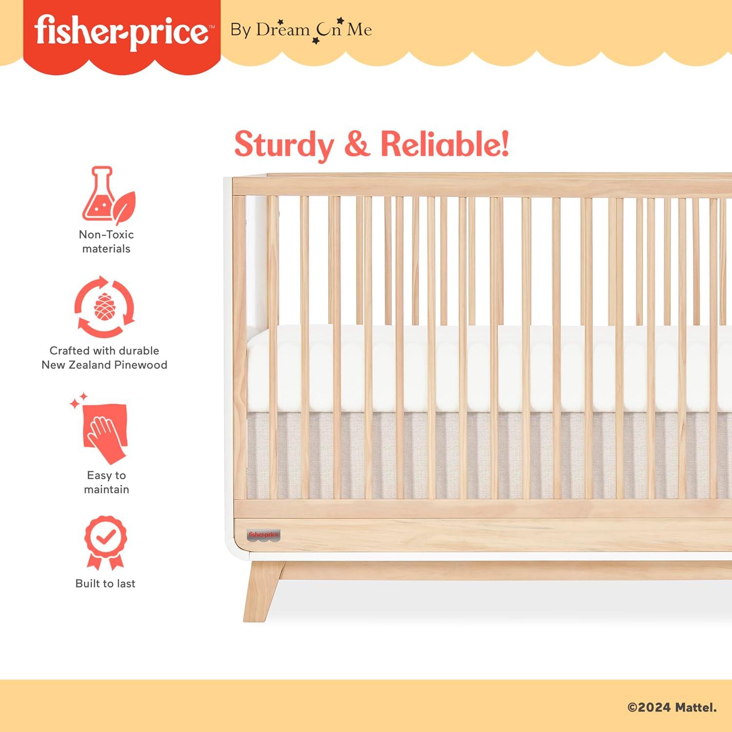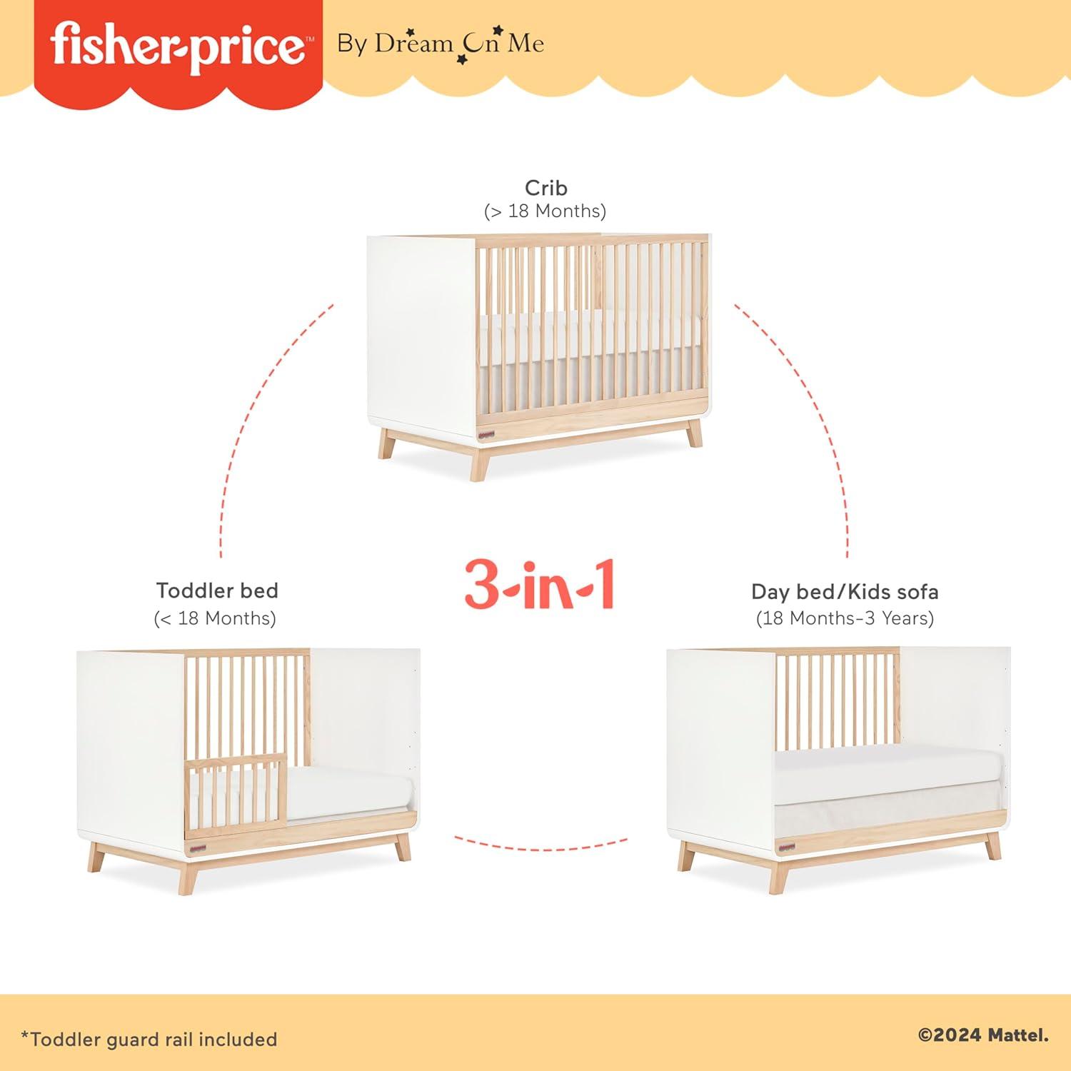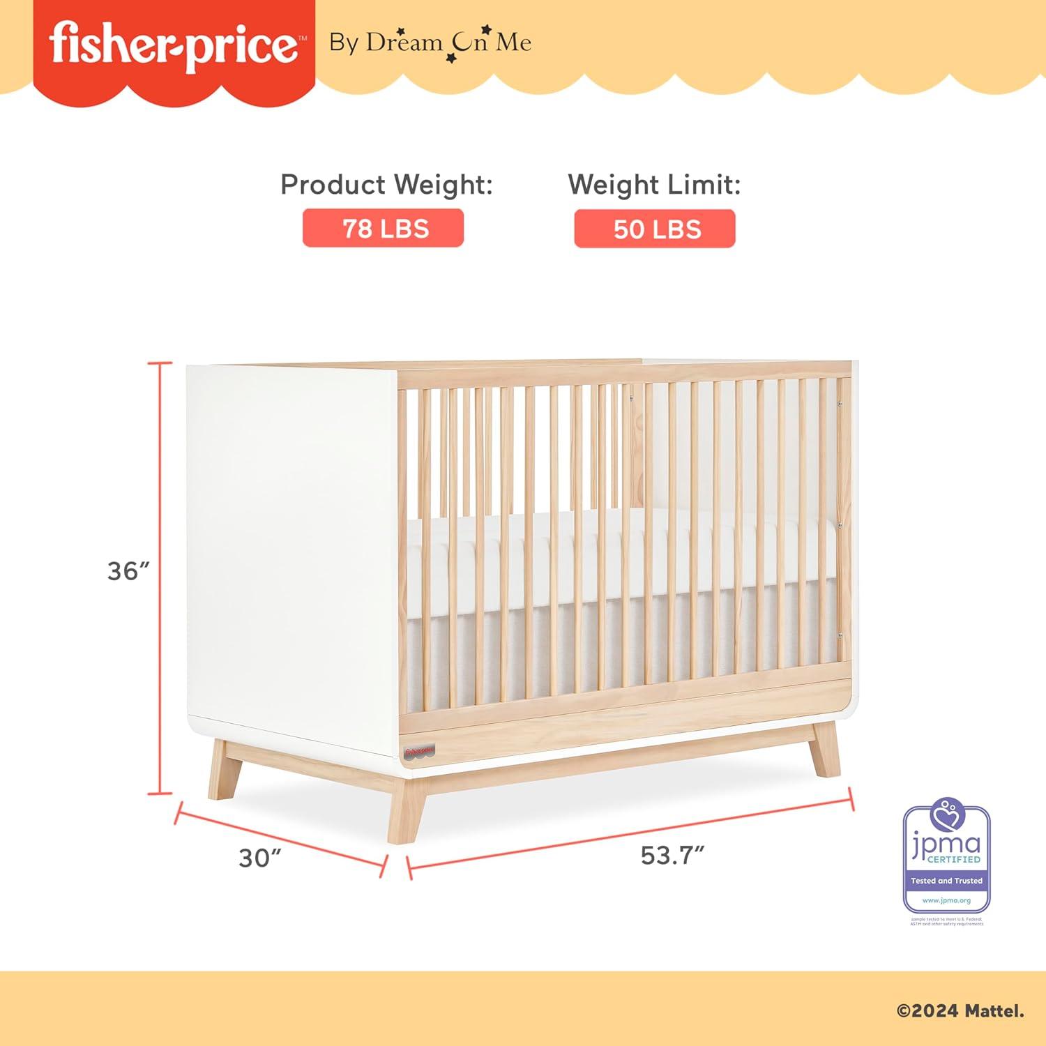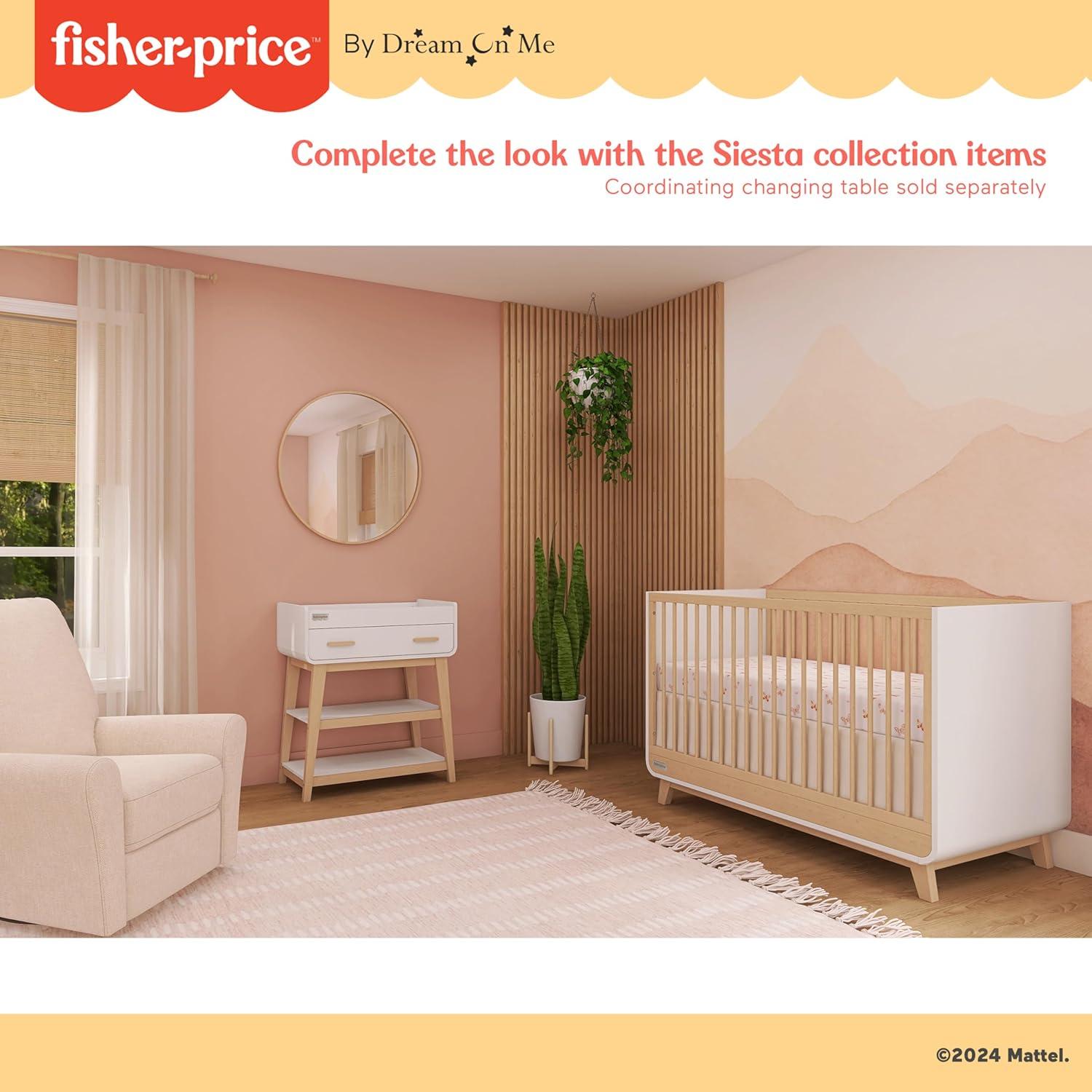 Introducing the Fisher Price Siesta 3-in-1 Convertible Crib by Dream On Me – where fun and imagination meet sleep time! Designed for versatility, it seamlessly transforms from a crib to a toddler bed and even a full-size bed as your little one grows (Guard rail included). The Fisher-Price Siesta 3-in-1 Convertible Crib ensures your child's safety with JPMA certification and a commitment to non-toxic materials. Bring playfulness for your little one & convenience for you, as this crib is easy to assemble & super easy to maintain! Available in 3 delightful finishes – Blush Pink Vintage Oak, Weathered Vintage Oak, and Matte Black Vintage Oak, the Fisher-Price Siesta 3-in-1 Convertible Crib is where siestas & adventures begin! Product dimensions are 53.7” L x 30” W x 36” H, with a weight of 78 Lbs.