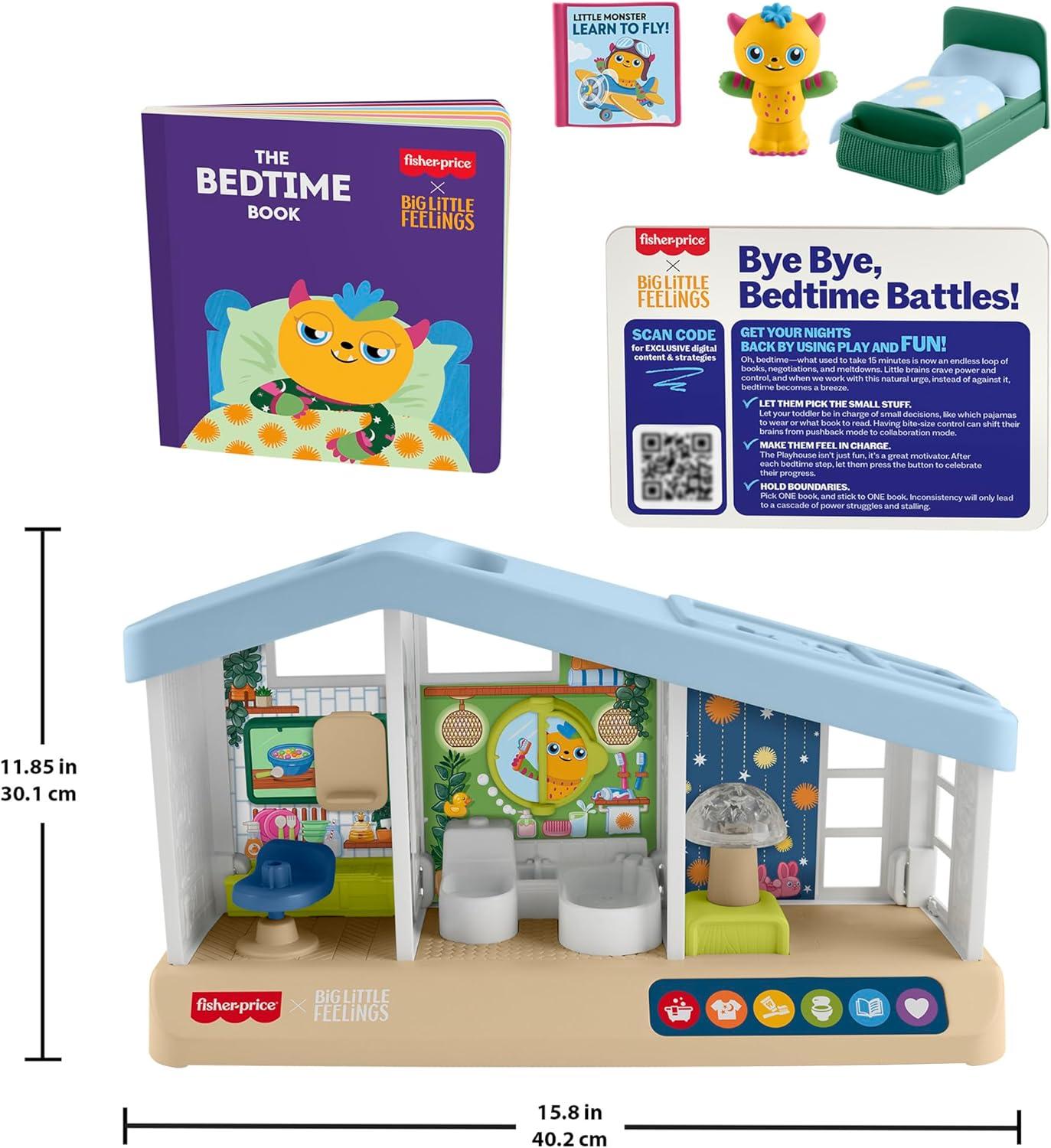Bedtime battles are over. The Fisher-Price Big Little Feelings Bedtime Routine Kit was created to help parents and kids with sleep struggles and sticking to a bedtime routine. This curated set includes an electronic house playset, little monster figure, a custom board book, and an exclusive Big Little Feelings mini-course with strategies for parents. The interactive home playset engages kids, encouraging pretend play and helps them stay on-task at nighttime with fun songs and phrases that introduce routine steps to follow. The board book helps reinforce those steps at bedtime with a fun story and is a great addition to your family library. Colors and decorations may vary.