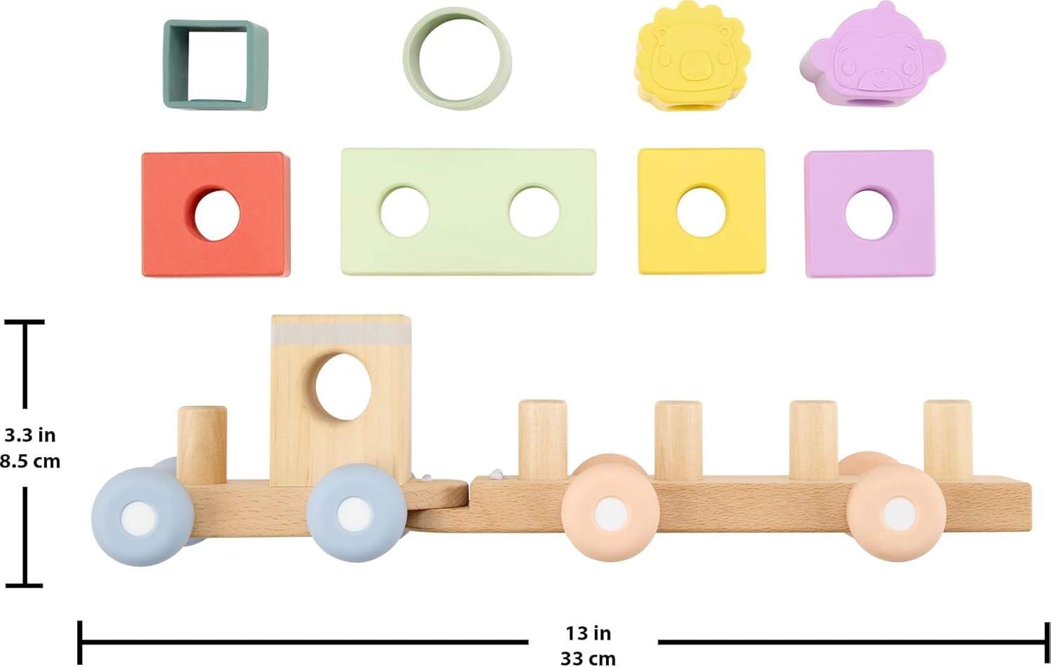 9 pieces! Includes wooden train, 4 wooden blocks, and 4 soft silicone shapes