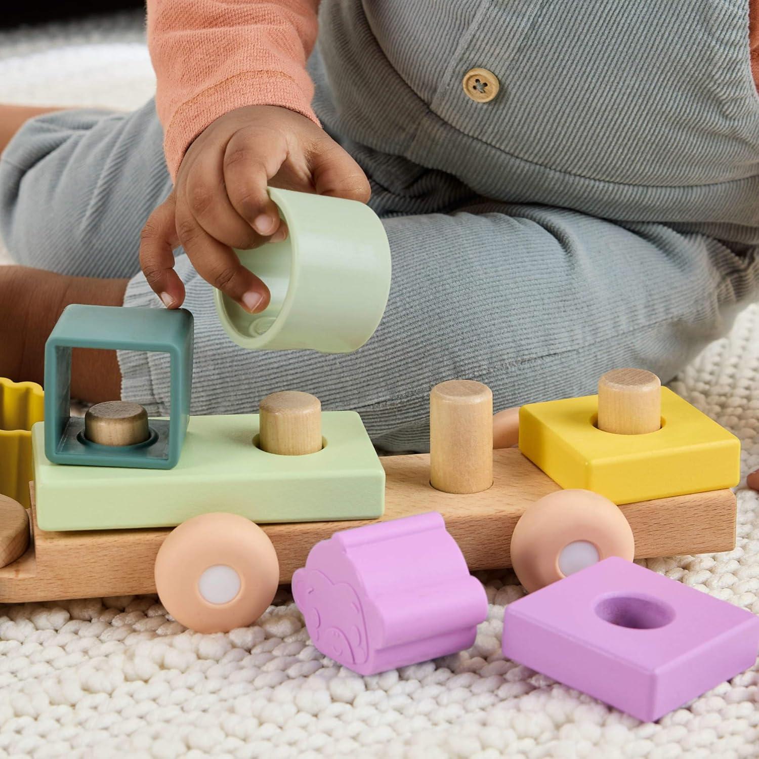 Babies and toddlers can stack and roll into exciting imaginary adventures with the Wood and Silicone Stacking Train toy from Fisher-Price. This push-along activity toy features a wooden toy train plus 4 wooden blocks and 4 silicone shapes for mini conductors to mix, match, and stack across the train. Made with wood from Forest Stewardship Council-certified sources (FSC-N004566) and decorated with non-toxic, water-based paints, this toddler toy train helps foster hand-eye coordination and motor skills. Colors and decorations may vary.