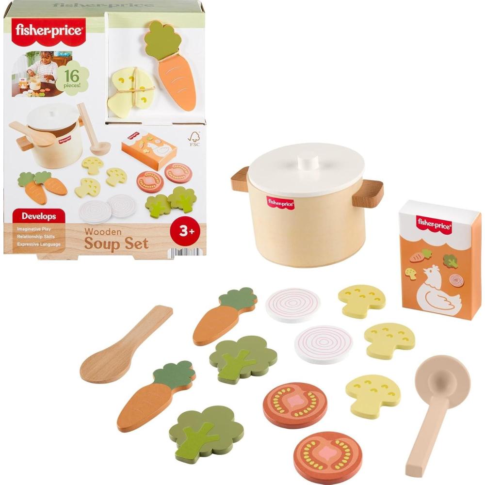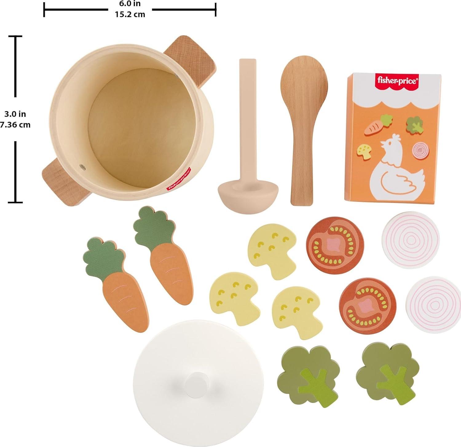 Fisher-Price Wood Kitchen Toy Veggie Soup, Tiny Garden 16-Piece Wooden Pretend Cooking Playset for Preschool Kids Ages 3+ Years (Amazon Exclusive)(Veggie Soup)