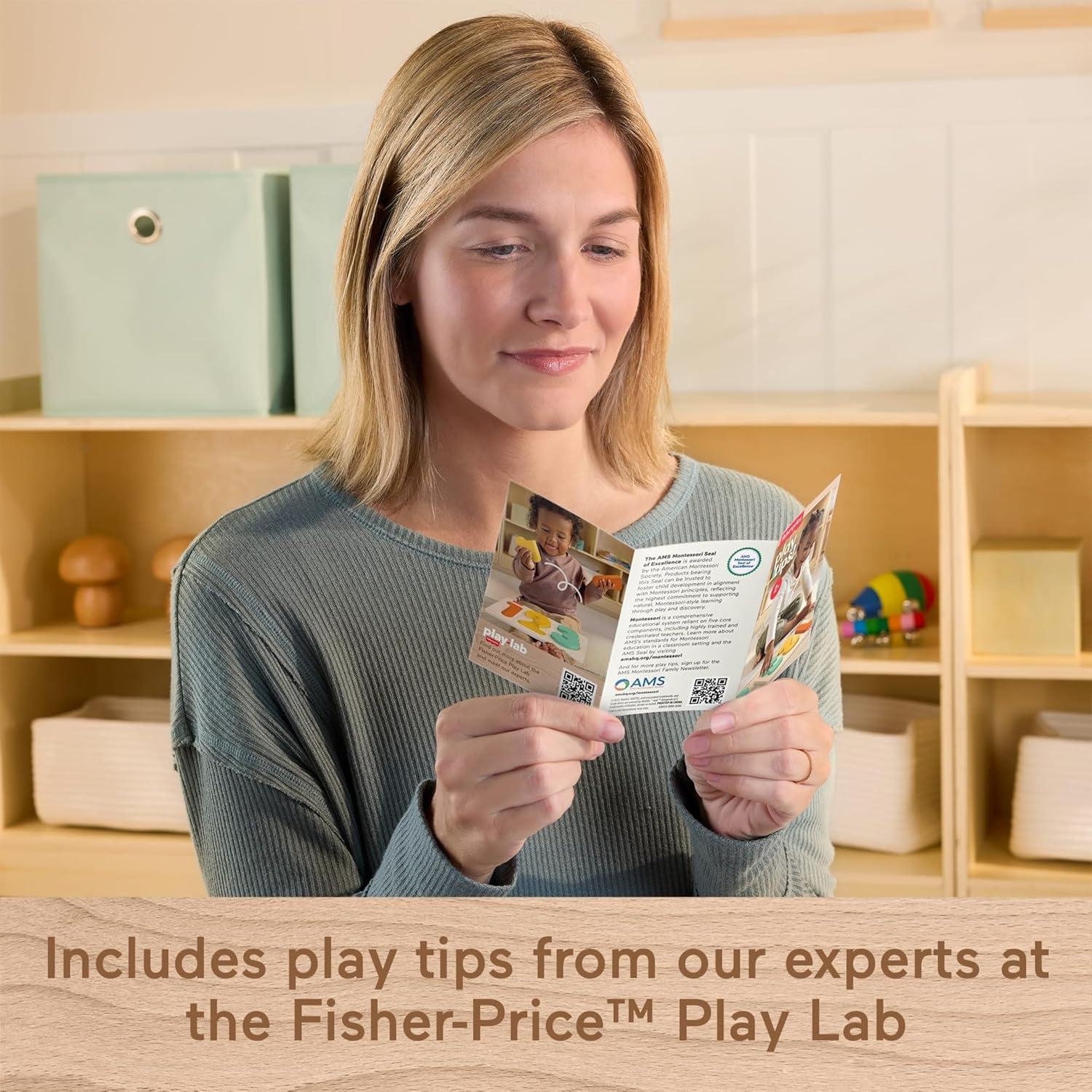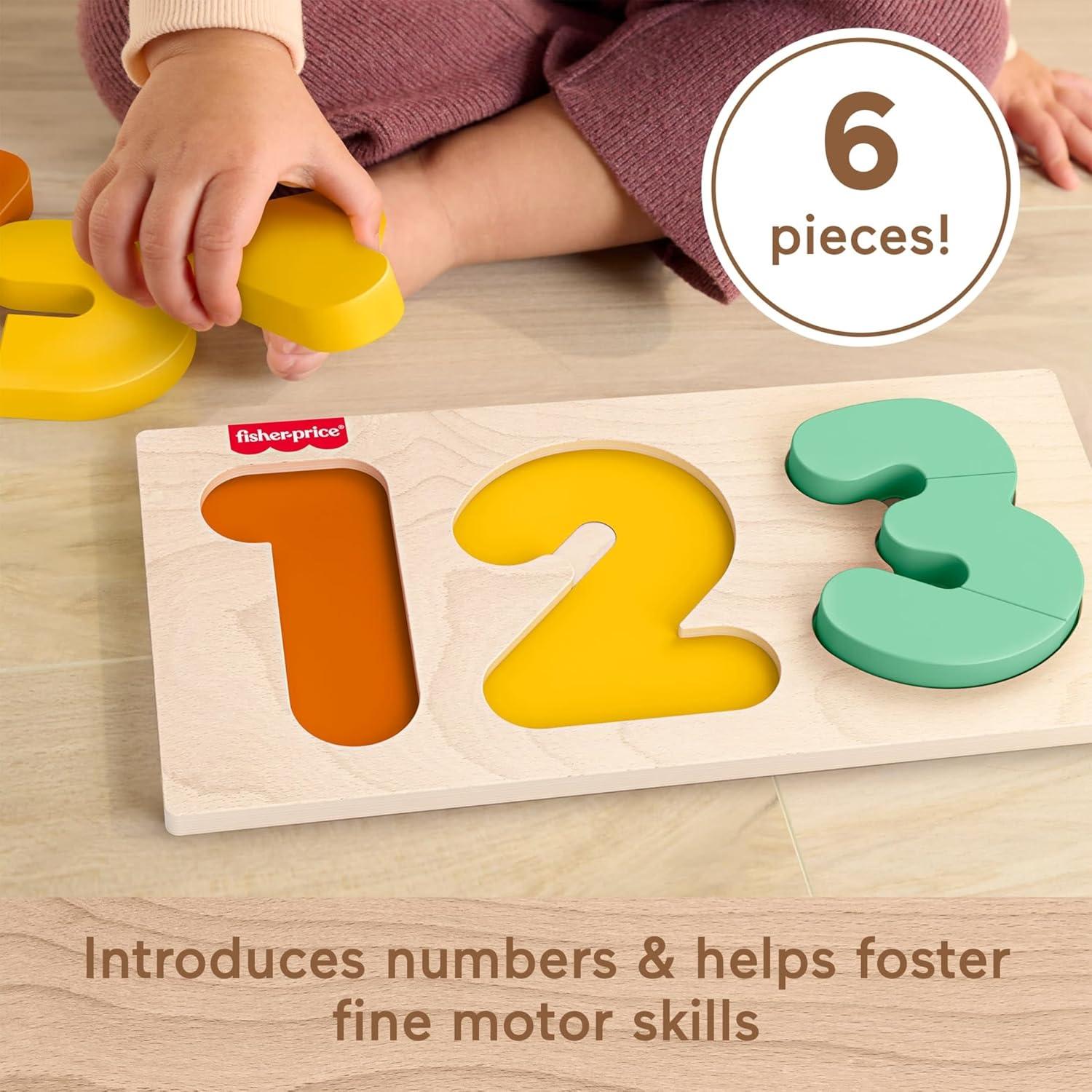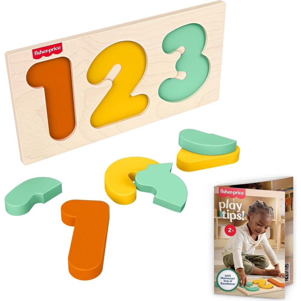 Toddlers can work their fine motor skills while exploring numbers and counting with this Montessori Wooden 1-2-3 Puzzle from Fisher-Price. This set includes a storage tray and 6 pieces for kids to puzzle together to build the numbers. Inspired by Montessori activities, each number in the puzzle is built with a corresponding number of pieces to help deepen kids’ understanding. Made with wood from Forest Stewardship Council-certified sources (FSC-N004566) and decorated with non-toxic, water-based paints. Colors and decorations may vary.