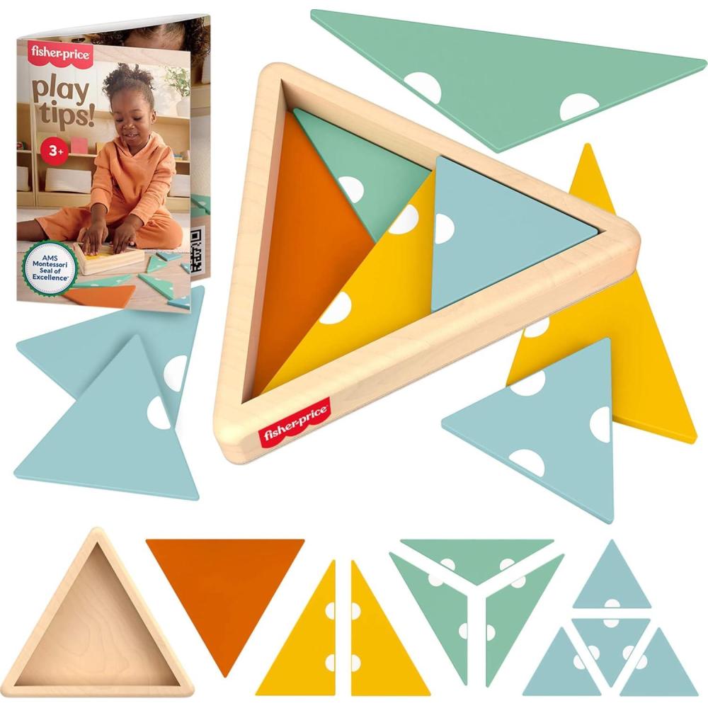 Kids can explore how shapes can be broken down and build back up again with this Montessori Wooden Triangle Puzzle from Fisher-Price. Inspired by the classic Montessori activity, this set includes a storage tray and 10 pieces for kids to puzzle together to build different triangles. Color-coded pieces and decorative dot patterns help guide kids as they complete the puzzle on their own. Made with wood from Forest Stewardship Council-certified sources (FSC-N004566) and decorated with non-toxic, water-based paints. Colors and decorations may vary.