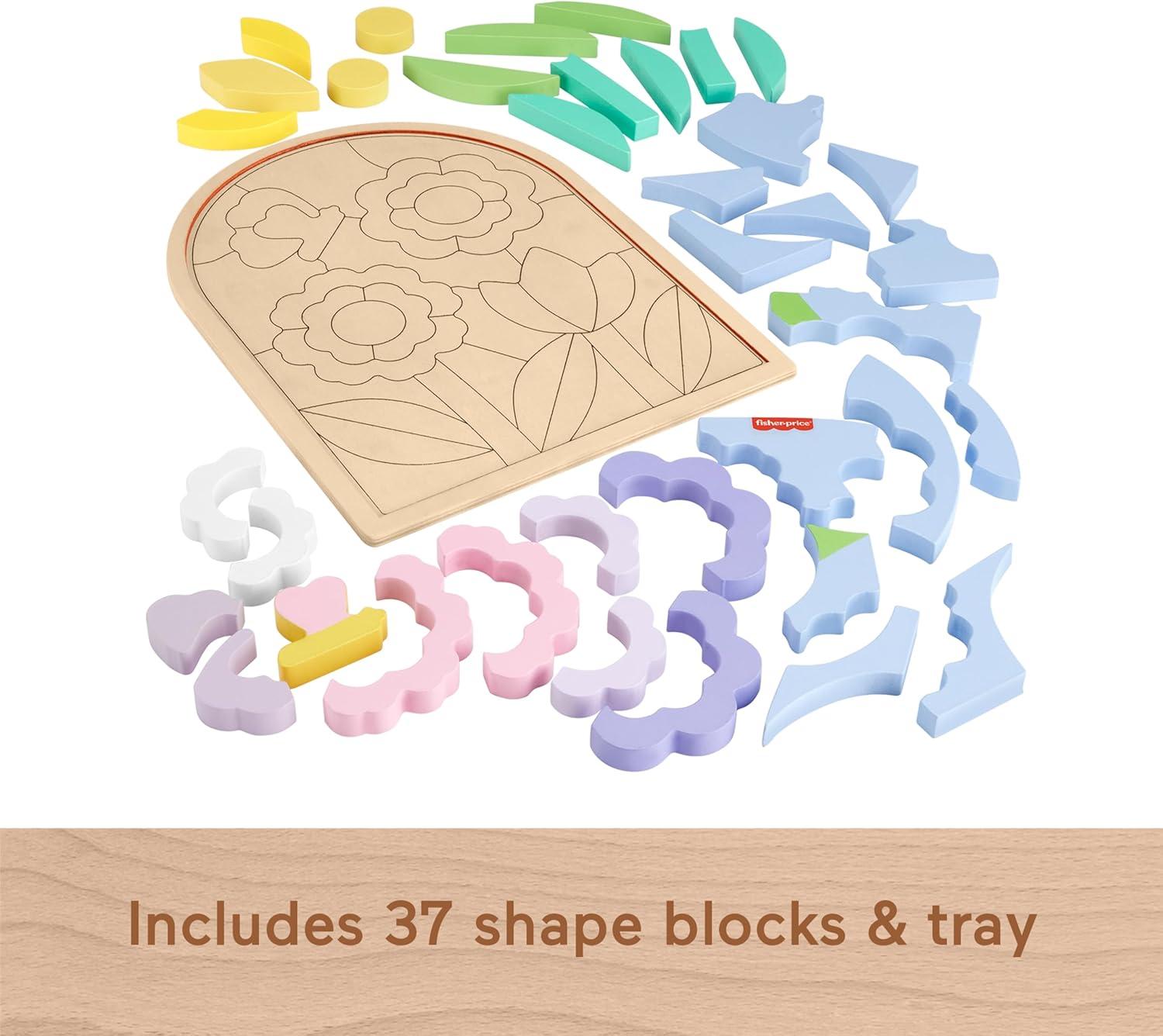 This Wooden Flower Puzzle Blocks set from Fisher-Price lets kids stack, sort and build fun floral designs This colorful puzzle includes 37 shape blocks for kids to stack in free-play or sort into the tray, which features guidelines to help kids create the flower garden design. As kids stack and sort the puzzle pieces, they’ll be exercising their hand-eye coordination, creativity, and problem-solving skills. Made with wood from well-managed, Forest Stewardship Council-certified sources (FSC-N004566) and decorated with non-toxic, water-based paints. Colors and decorations may vary.