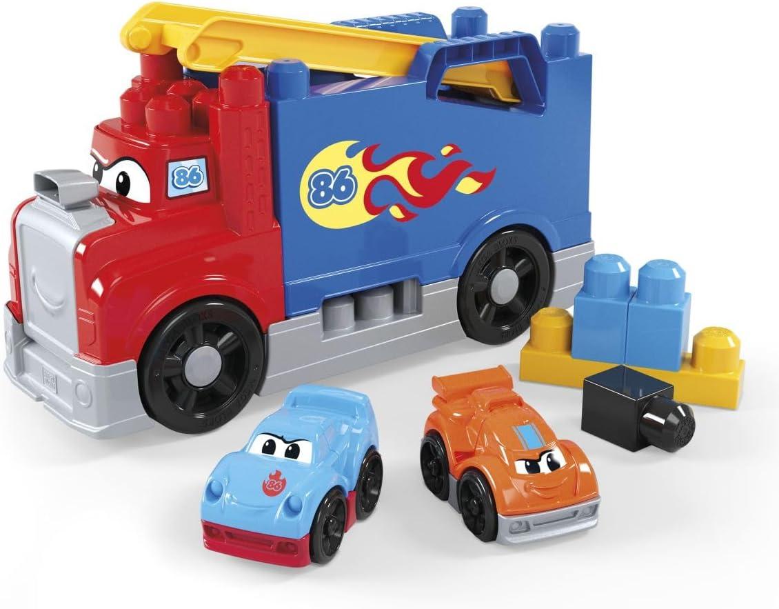 Toddlers can build big races and zoom into playtime with this big rig truck and 2 easy-to-build race cars. Little builders can use the blocks and pieces to reconfigure the rig into a racetrack and build all kinds of stunts. They can arrange the ramp in different ways for more ways to play. When playtime is over, blocks can be stored in the rig for easy cleanup and storage.