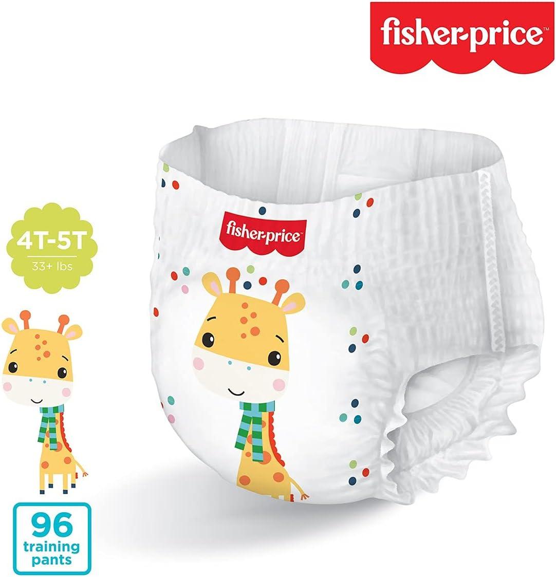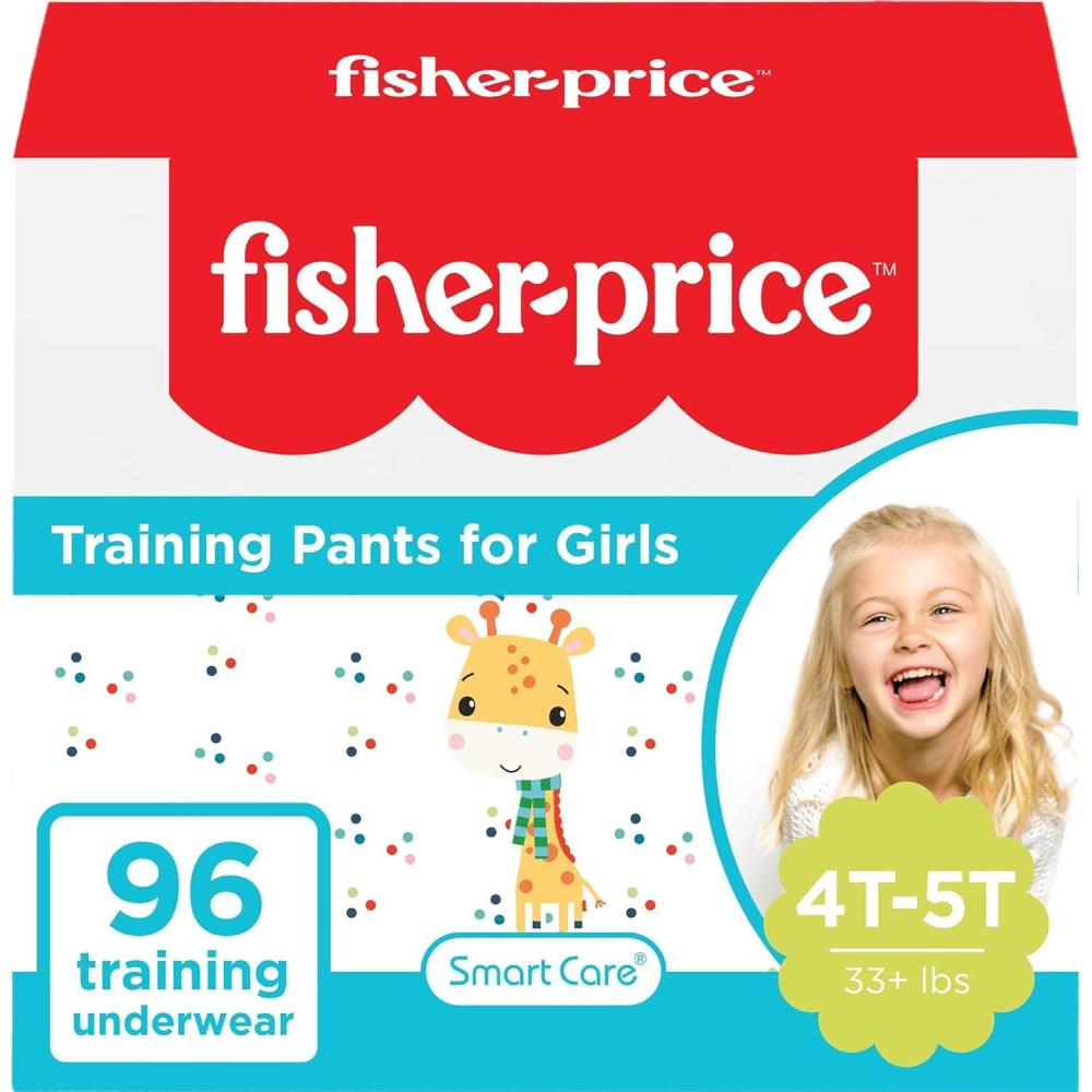 Fisher Price Training Pants for Girls 4T-5T (33+lbs) – 56 counts Latex free and Fragrance free. Cloth like breathable Hypoallergenic Full Elastic waist band Leak guard cuffs Wetness indicator Extra Absorbency